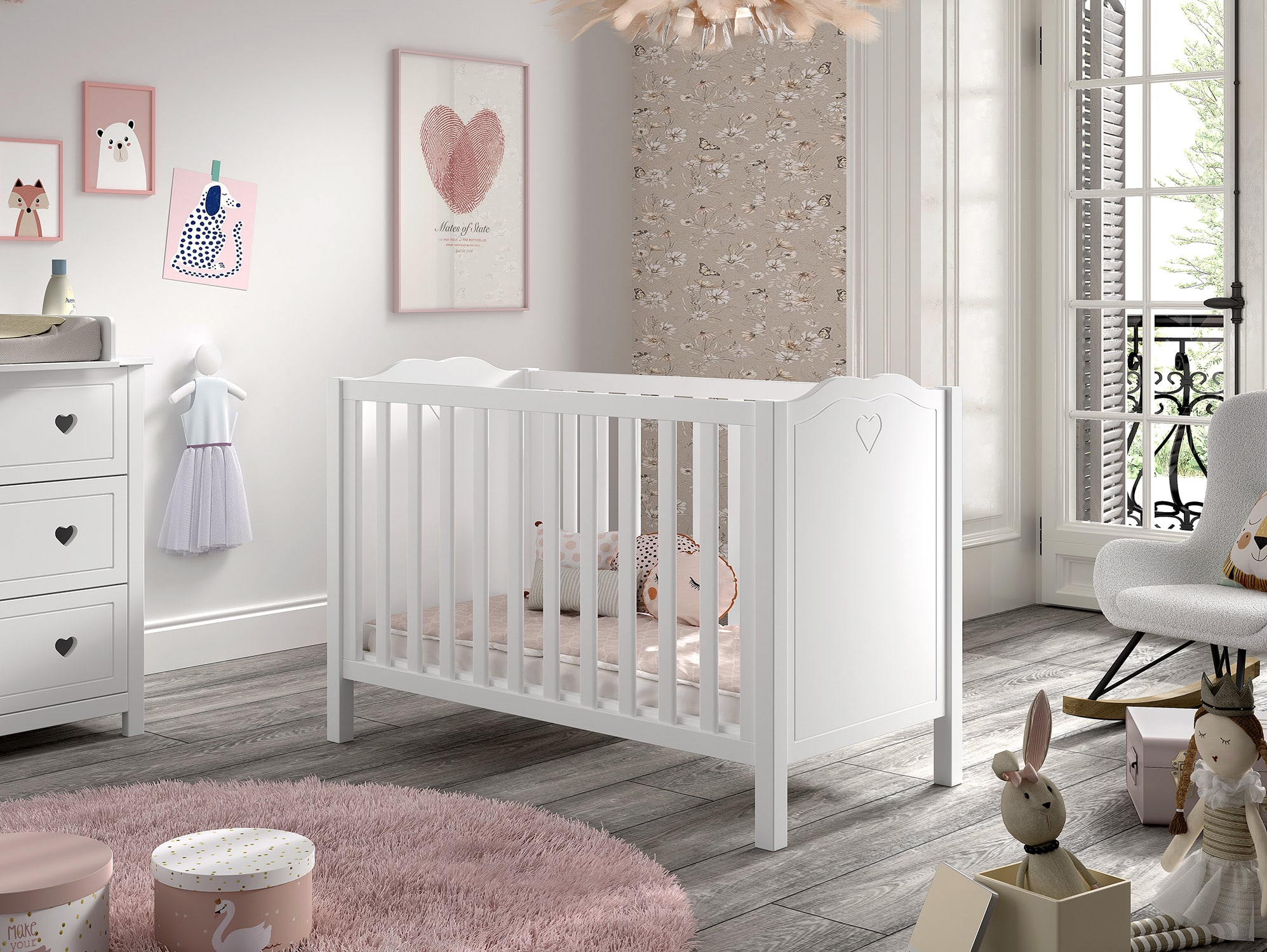 Het babybed (60 x 120 cm) in wit uit de AMORI collectie combineert een tijdloos, fris design met zachte, romantische accenten. Het is de favoriete kamer van iedereen die houdt van elegante meubels. De lattenbodem is inclusief en kan op 3 hoogtes versteld worden voor optimaal gebruiksgemak. Laat je verleiden door de charme van deze babykamer met hartjesdetail. Een liefdevol welkom.