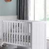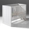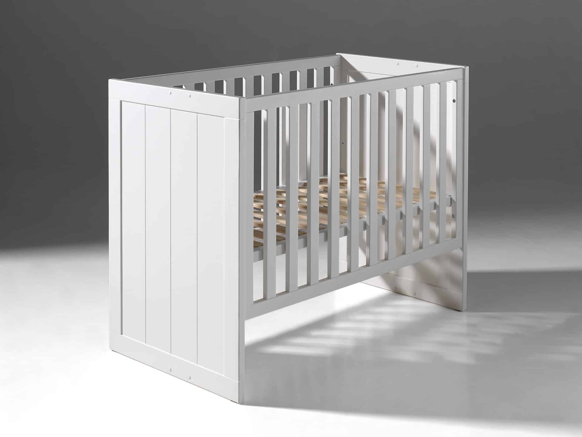 Het ERIK babybed (60×120) is vervaardigd uit wit gelakte MDF. Het hoofd- en voetbord zijn afgewerkt met verticale groeven. De lattenbodem is verstelbaar in 3 hoogtes.