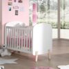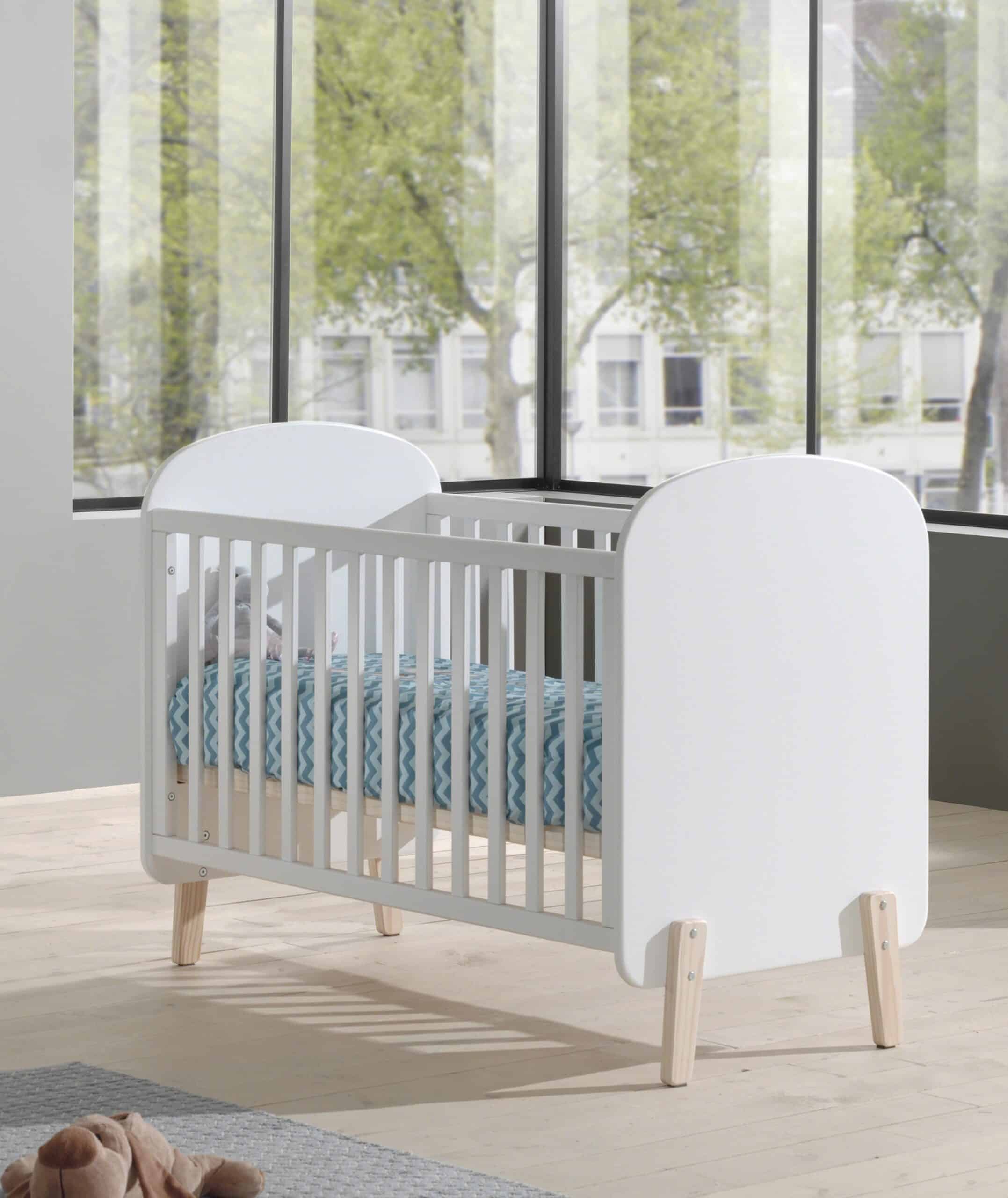 Het KIDDY babybed (60 x 120 cm) is vervaardigd uit wit gelakte MDF en heeft een warme uitstraling door het afgeronde hoofd- en voeteinde, de zachte witte kleur en de poten in massief hout. De lattenbodem is verstelbaar op 3 hoogtes zodat het zich aanpast aan de behoeften van het opgroeiende kind.