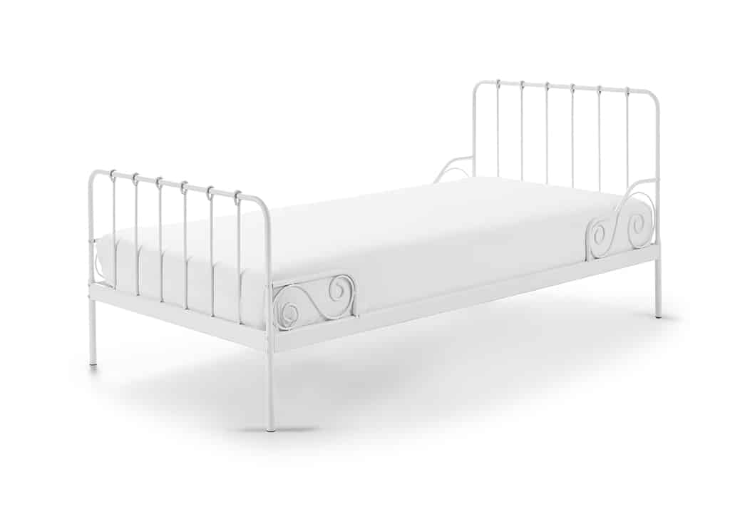 Het metalen bed (90 x 200 cm) in wit van de ALICE collectie heeft een vintage en romantische uitstraling. Het bed is voorzien van hoge bedsponden, wat het extra stevig en stabiel maakt. De lattenbodem is inbegrepen.