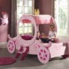 Dit ROYAL PRINCESS KATE bed is vervaardigd uit roze gelakte MDF. Het bed heeft de vorm van een koets met 2 treden. De lattenbodem is inclusief en is geschikt voor een matras van 90x200cm.