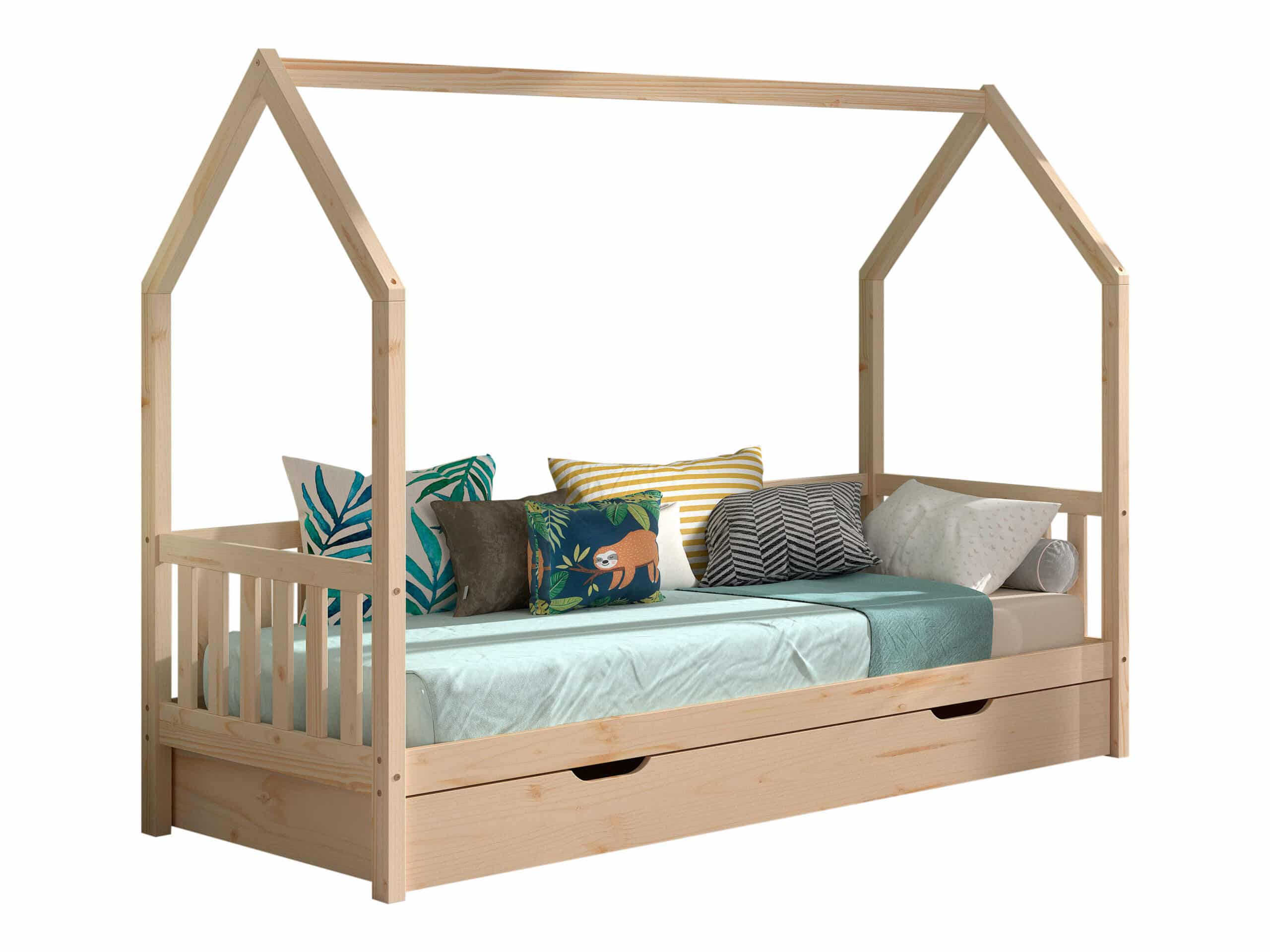 Het CABANE huisbed (90 x 200 cm) met hekje in de kleur natuur is vervaardigd in massief grenen. Het speelse design is een echte blikvanger elke kinderkamer. Dit bed beschikt over een hekje langs 3 kanten dat kan dienen als uitvalbeveiliging, maar dat ook ideaal is als zitbank. Maak het extra gezellig met kleurrijke kussens, dekentjes en een lichtslinger als decoratie. De bedlade biedt een extra slaapplek voor een gast maar kan net zo goed dienen als extra opbergruimte. Onderaan de bedlade zijn wieltjes voorzien zodat deze gemakkelijk kan worden in- en uitgetrokken.