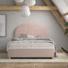 Dit gestoffeerde bed (90 x 200 cm) van de MOON collectie heeft een unieke boucl� bekleding in roze. De combinatie van deze stofbekleding en het afgeronde hoofdbord geven het bed een warme uitstraling en gezellig karakter. Een extra voordeel aan dit bed is dat er opbergruimte onder bed bevindt. De lattenbodem en matras kunnen gemakkelijk omhoog getrokken worden door middel van een lint. De poef in roze is een eye-catcher. De unieke boucl� stof cre�ert een warme uitstraling waardoor deze poef perfect in elke woonkamer, slaapkamer of leeshoek past. Dit item kan gebruikt worden als extra zitplaats, voetenbankje of als trendy nachttafel naast het bed waar je jouw boek of telefoon binnen handbereik kunt houden. Het is niet alleen een praktische meubelstuk, maar ook een decoratief item dat de ruimte verrijkt.