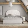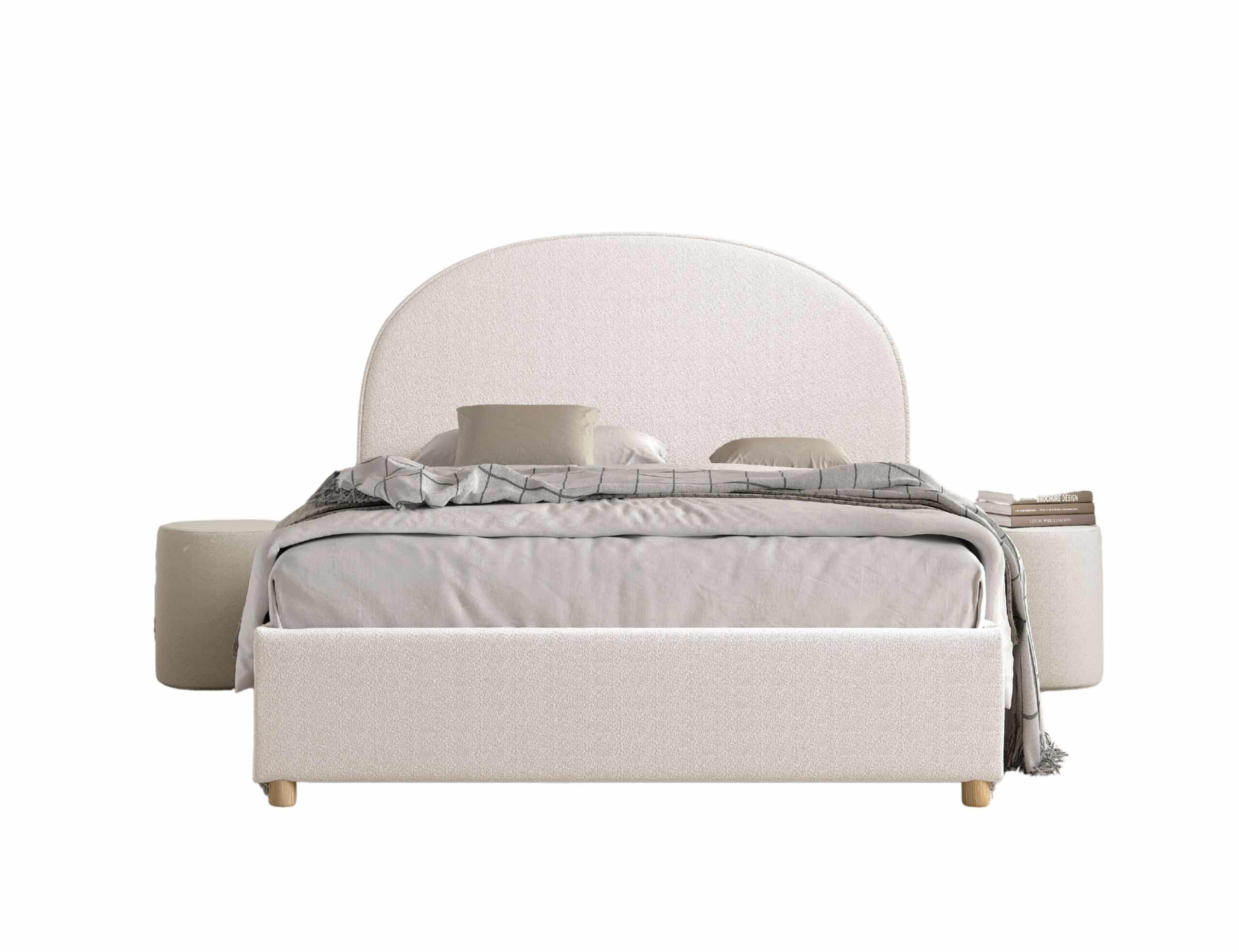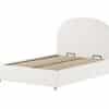 Dit gestoffeerde bed (90 x 200 cm) van de MOON collectie heeft een unieke boucl� bekleding in wit. De combinatie van deze stofbekleding en het afgeronde hoofdbord geven het bed een warme uitstraling en gezellig karakter. Een extra voordeel aan dit bed is dat er opbergruimte onder bed bevindt. De lattenbodem en matras kunnen gemakkelijk omhoog getrokken worden door middel van een lint. De poef in wit is een eye-catcher. De unieke boucl� stof cre�ert een warme uitstraling waardoor deze poef perfect in elke woonkamer, slaapkamer of leeshoek past. Dit item kan gebruikt worden als extra zitplaats, voetenbankje of als trendy nachttafel naast het bed waar je jouw boek of telefoon binnen handbereik kunt houden. Het is niet alleen een praktische meubelstuk, maar ook een decoratief item dat de ruimte verrijkt.