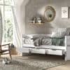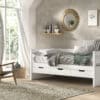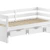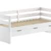 Het MARGRIT kajuitbed (90 x 200 cm) in wit is vervaardigd in massieve grenen. Dit bed beschikt over 3 handige opberglades. Het minimalistische en stijlvolle design maakt dat het in elk interieur past. Dit bed beschikt over een hekje langs 3 kanten met horizontale spijlen dat kan dienen als uitvalbeveiliging, maar dat ook ideaal is als zitbank in combinatie met kussens.