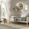 Het MARGRIT kajuitbed (90 x 200 cm) in milky pine is vervaardigd in massieve grenen. Het minimalistische en stijlvolle design maakt dat het in elk interieur past. Dit bed beschikt over een hekje langs 3 kanten met horizontale spijlen dat kan dienen als uitvalbeveiliging, maar dat ook ideaal is als zitbank in combinatie met kussens.