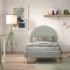 Dit gestoffeerde bed (90 x 200 cm) van de MOON collectie heeft een unieke boucl� bekleding in groen. De combinatie van deze stofbekleding en het afgeronde hoofdbord geven het bed een warme uitstraling en gezellig karakter. Deze collectie past in elk interieur en kan makkelijk gecombineerd worden.