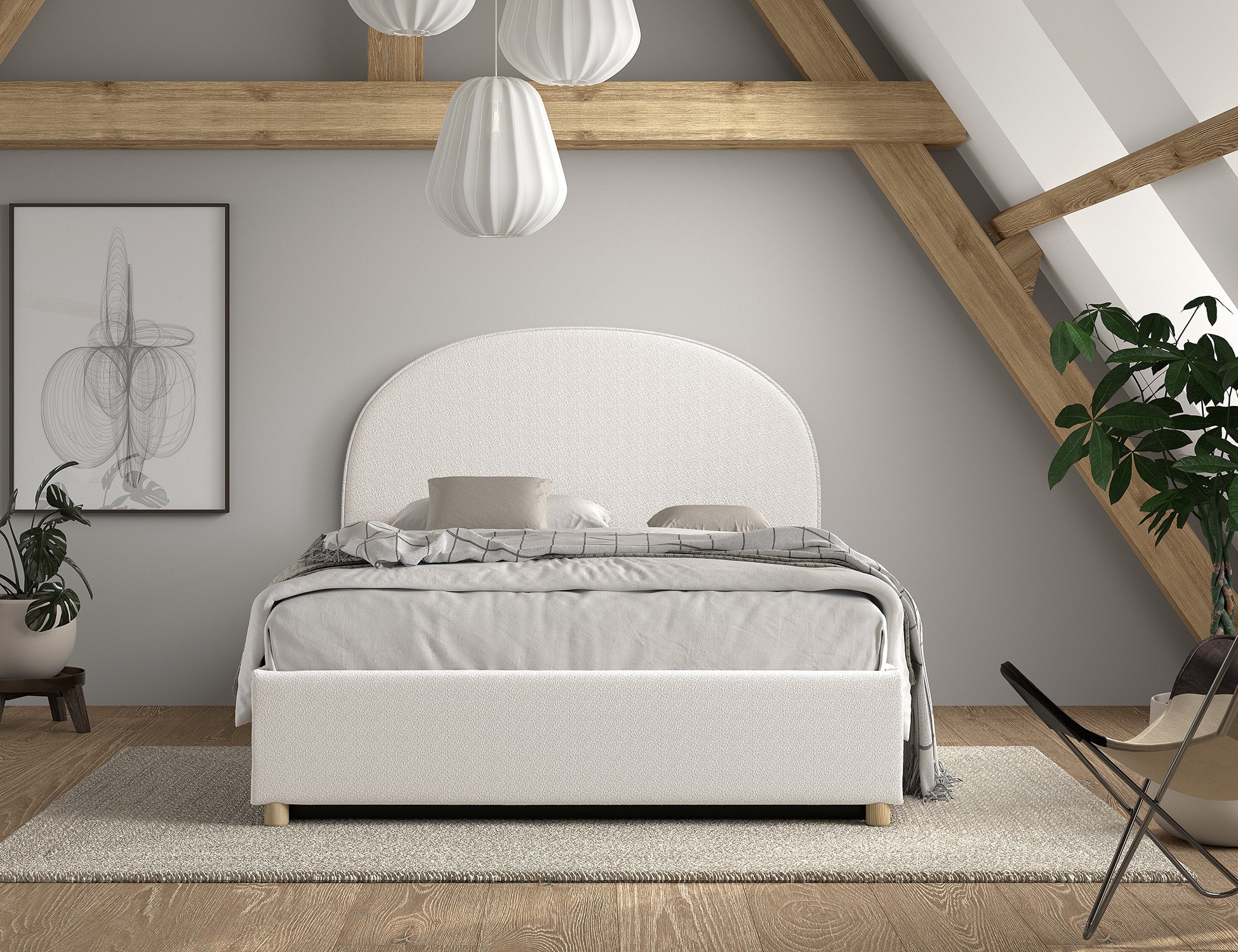Dit gestoffeerde bed (140 x 200 cm) van de MOON collectie heeft een unieke boucl� bekleding in wit. De combinatie van deze stofbekleding en het afgeronde hoofdbord geven het bed een warme uitstraling en gezellig karakter. Een extra voordeel aan dit bed is dat er opbergruimte onder bed bevindt. De lattenbodem en matras kunnen gemakkelijk omhoog getrokken worden door middel van een lint. Deze collectie past in elk interieur en kan makkelijk gecombineerd worden.