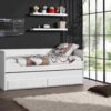 Dit ROBIN kajuitbed is gemaakt uit wit gelakte MDF in combinatie met massief grenen. De lattenbodem is niet inbegrepen. Dit kajuitbed beschikt over een rolbed met 2 opberglades met soft-close systeem. Het kajuitbed is afgewerkt met fijne verticale groeven.