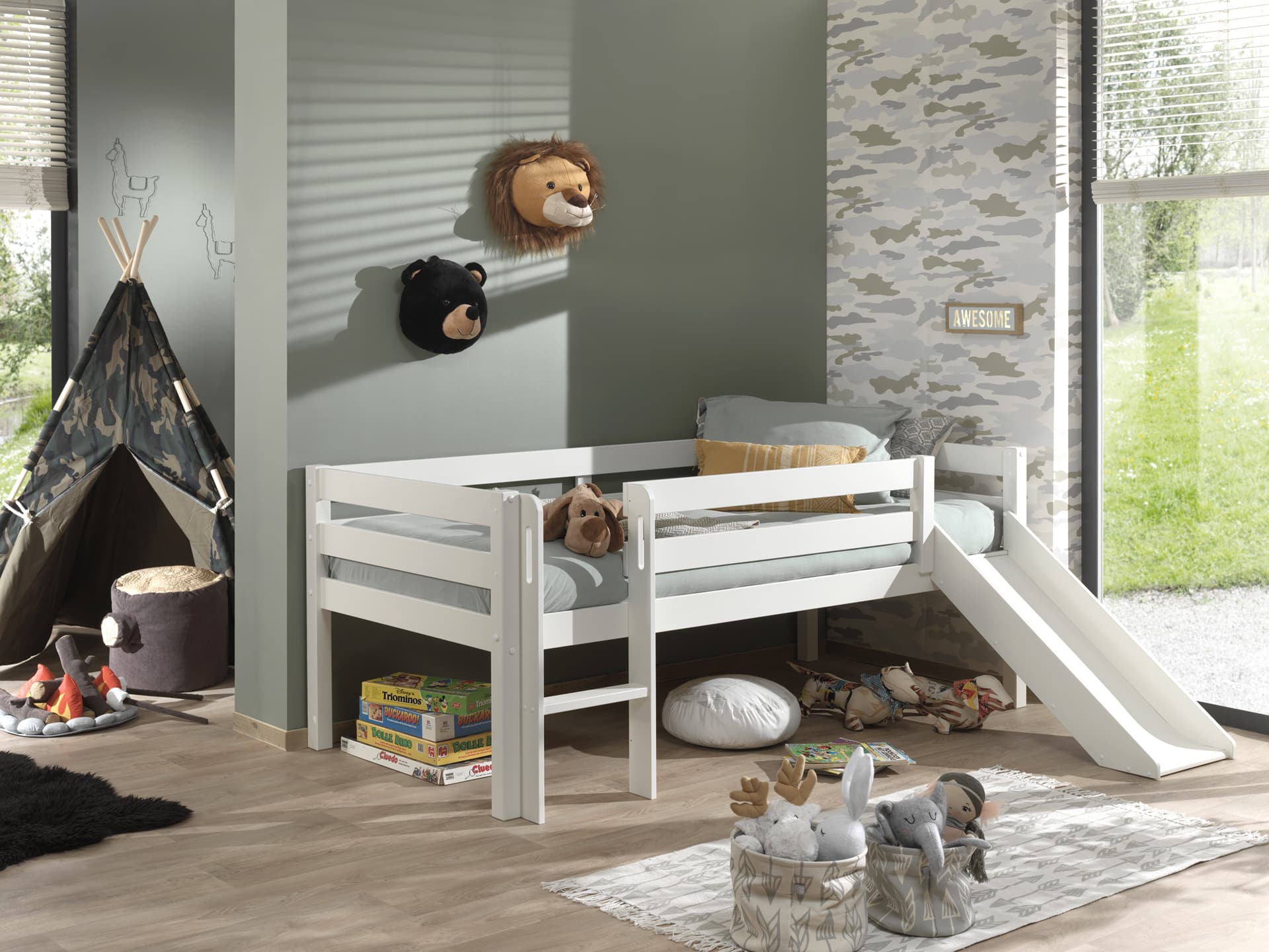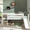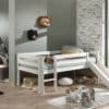Deze PINO mid-sleeper met glijbaan is wit gelakt en gemaakt uit massief Scandinavisch grenen hout. De lattenbodem is inclusief en is geschikt voor een matras van 90 x 200 cm. De ruimte tussen het bed en de grond is 41.5 cm.