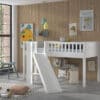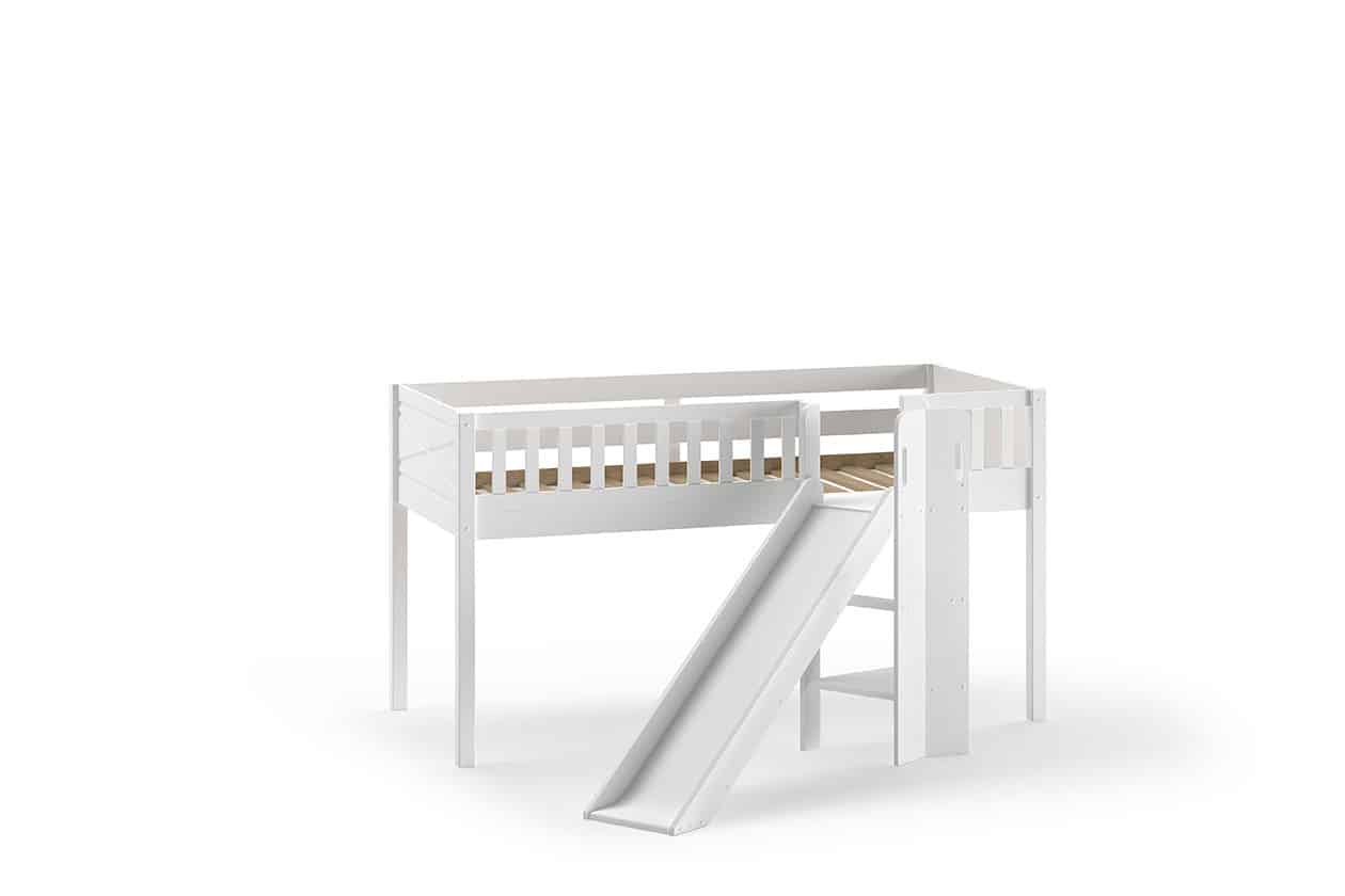 De SCOTT halfhoogslaper (90 x 200 cm) met glijbaan in wit is vervaardigd uit massief Scandinavisch grenen. Het is niet alleen een comfortabele slaapplek, maar geeft ook eindeloos speelplezier. Er kunnen optioneel lades toegevoegd worden die kunnen ingezet worden als opbergruimte voor speelgoed, boeken, kussens,… Dit maakt het ideaal voor kamers waar ruimtebesparing essentieel is.