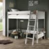 Deze LONDON hoogslaper (90×200) in wit heeft een Scandinavisch uitzicht in combinatie met de massieve den. De ruimte onder het bed kan benut worden als speelhoek of als studeerhoek, door middel van een bureau onder te plaatsen. De ladder kan zowel links al rechts geplaatst worden.