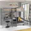 Deze PINO hoogslaper in grijs met zetelbed is gemaakt uit massief scandinavisch grenen hout. De lattenbodem en de matras van het zetelbed zijn inclusief. De trap bevindt zich in het midden van het bed. Onder het bed is er een kant met bureau en aan de andere kant het zetelbed. De positie van het zetelbed en het bureau kan omgewisseld worden. De lattenbodem van het stapelbed is ook inclusief en geschikt voor een matras van 90x200cm.