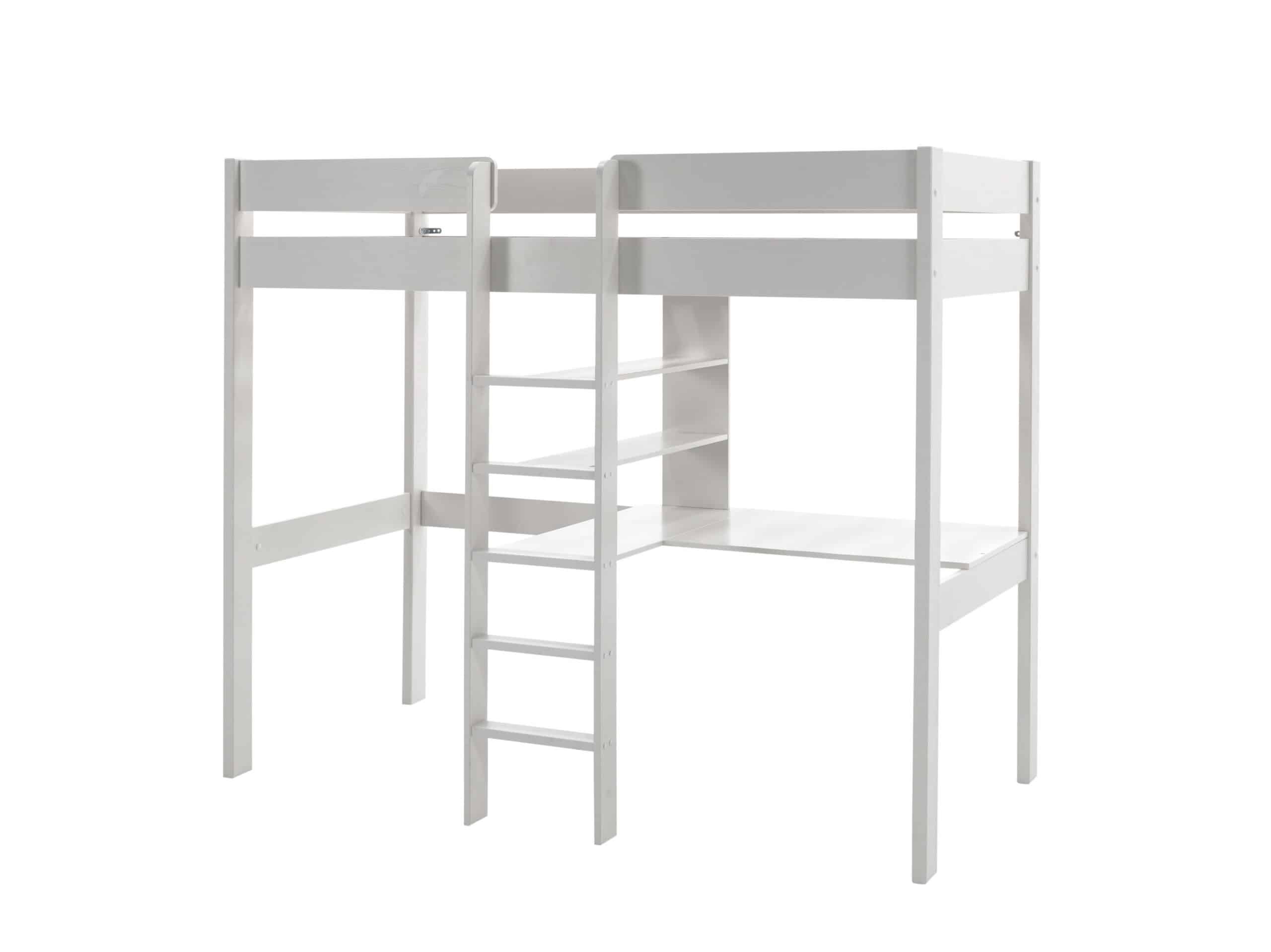 De PINO hoogslaper is vervaardigd uit wit gelakt massief Scandinavisch grenen hout. De lattenbodem is inbegrepen. De ladder bevindt zich in het midden van het bed en is voorzien van 3 legplanken. Onder het bed is er een bureau voorzien, die aan beide kanten van de ladder gemonteerd kan worden.