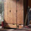Deze 3-deurs kleerkast uit de ALEX collectie is vervaardigd uit massief grenen met een uitvoering in geborsteld dennenhout. De combinatie met het zwarte metaal maakt dat het een stoere, robuuste uitstraling heeft. De kleerkast beschikt over een legplank met hangrail en achter de rechterdeur bevinden zich 4 legplanken. Onderaan zijn er ook 2 ruime lades zodat er voldoende plaats is voor het opbergen van kledij, beddengoed, persoonlijke spullen,…