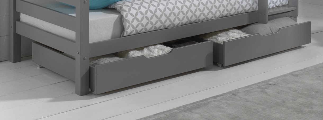 Deze set van 2 grijsgelakte PINO lades bestaat uit massief Scandinavisch grenen hout. Deze 2 lades zijn perfect compatibel met onze PINO stapelbedden. Deze lades zijn jammer genoeg niet combineerbaar met het PINO Martin familiebed.