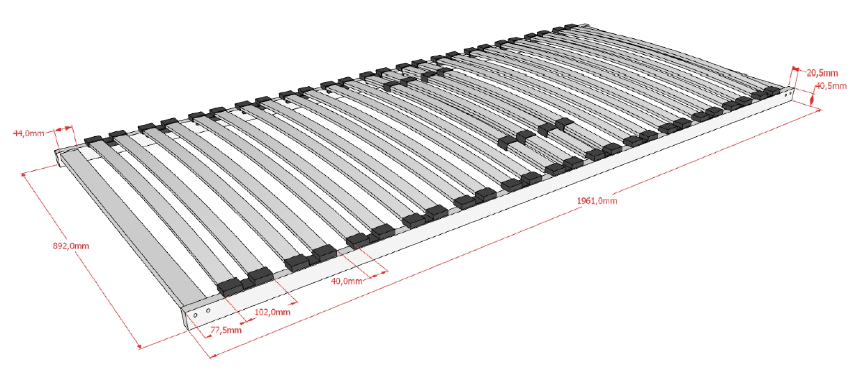 Deze lattenbodem beschikt over 26 latten en is vervaardigd uit stevig, hoogwaardig multiplex. De veerlatten van berk zijn opgeborgen in beweegbare kappen op de ligger. De lattenbodem heeft een afmeting van 90 x 200 cm.