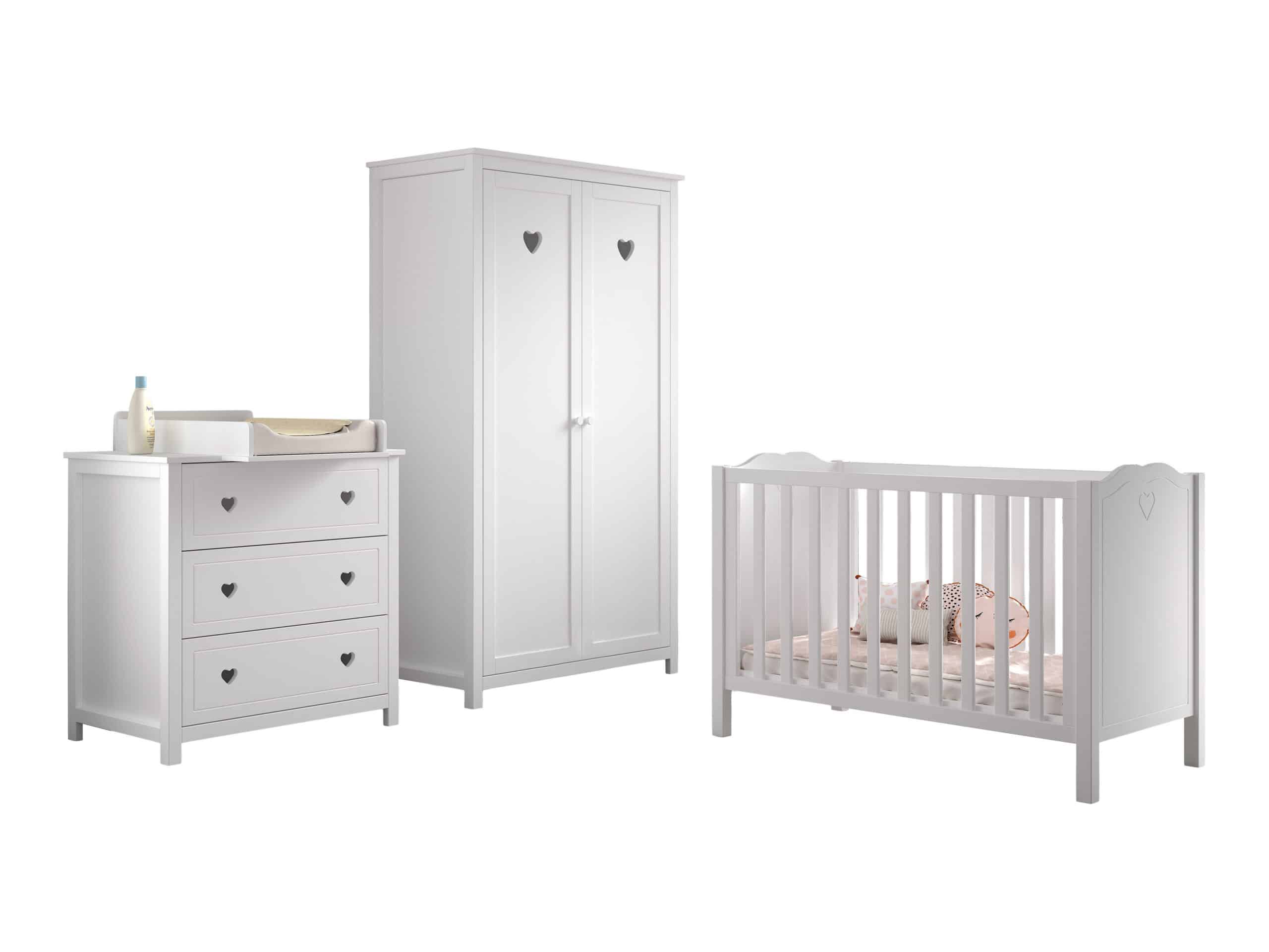 Het babybed (60 x 120 cm) in wit uit de AMORI collectie combineert een tijdloos, fris design met zachte, romantische accenten. Het is de favoriete kamer van iedereen die houdt van elegante meubels. De lattenbodem is inclusief en kan op 3 hoogtes versteld worden voor optimaal gebruiksgemak. De commode met opzetstuk is niet alleen een mooie aanvulling in de babykamer, maar ook zeer praktisch in te richten door de 3 ruime lades die beschikbaar zijn. De 2-deurs kast biedt voldoende opbergruimte en bestaat uit 2 legplanken en een kledingrail. Laat je verleiden door de charme van deze babykamer met hartjesdetail. Een liefdevol welkom.