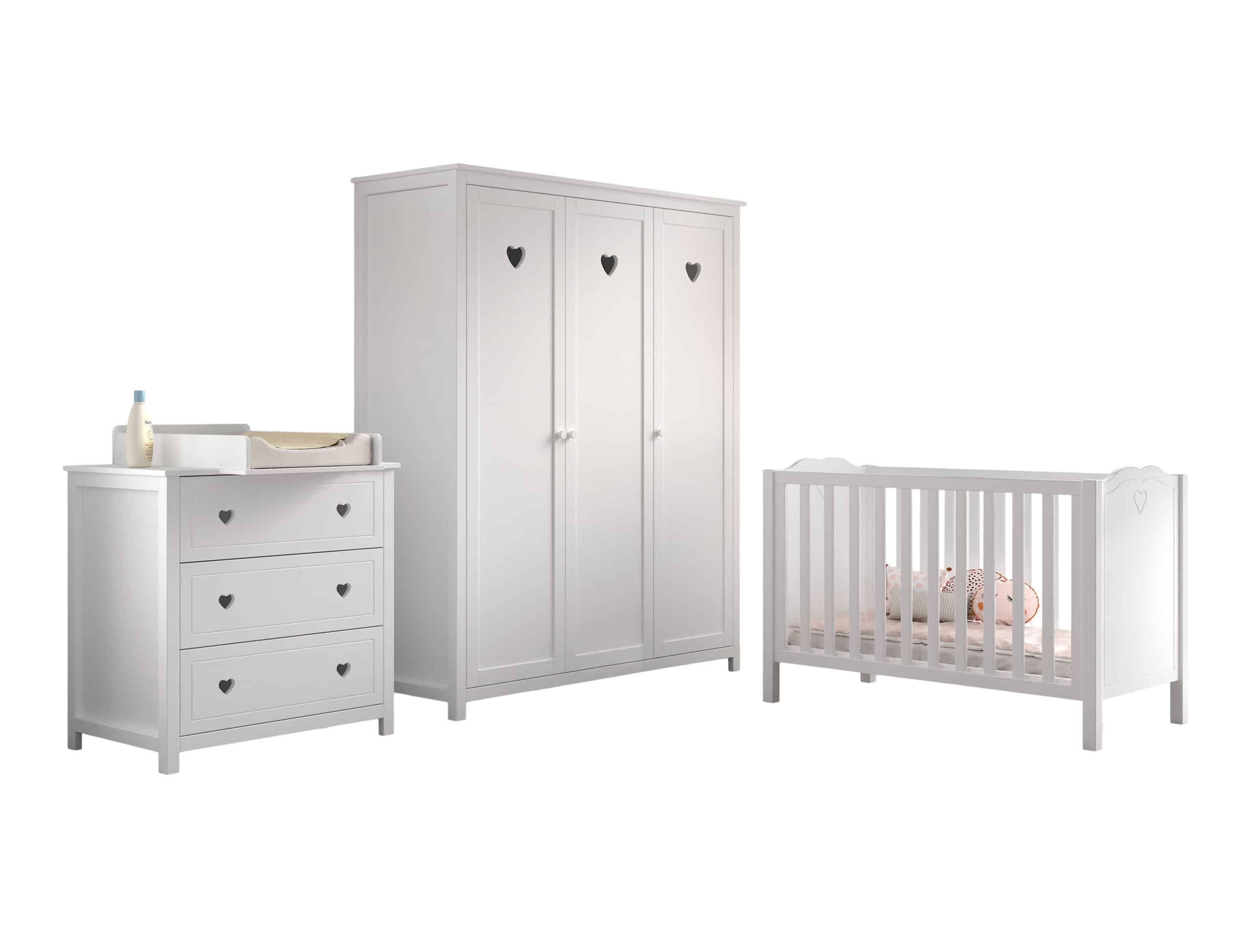 Het babybed (60 x 120 cm) in wit uit de AMORI collectie combineert een tijdloos, fris design met zachte, romantische accenten. Het is de favoriete kamer van iedereen die houdt van elegante meubels. De lattenbodem is inclusief en kan op 3 hoogtes versteld worden voor optimaal gebruiksgemak. De commode met opzetstuk is niet alleen een mooie aanvulling in de babykamer, maar ook zeer praktisch in te richten door de 3 ruime lades die beschikbaar zijn. De 3-deurs kast bestaat aan de linkerzijde uit 2 legplanken en 1 hangrail. Achter de rechterdeur bevinden zich 4 legplanken. Zo is er voldoende ruimte voor het opbergen van kledij, bedlinnen,� Laat je verleiden door de charme van deze babykamer met hartjesdetail. Een liefdevol welkom.