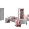 Het eenpersoonbed (90 x 200 cm) in wit uit de AMORI collectie combineert een tijdloos, fris design met zachte, romantische accenten. Het is de favoriete kamer van iedereen die houdt van elegante meubels. De lattenbodem is niet inbegrepen, maar hiervoor raden wij een lattenbodem aan met vast kader. De nachttafel beschikt over 3 lades en het bureau heeft een ruim werkoppervlak en 2 lades voor het opbergen van boeken, schoolmateriaal, persoonlijke spullen,… De boekenkast is verdeeld in 5 vakken en de kleerkast bestaat uit 2 legplanken en een kledingrail. Laat je verleiden door de charme van deze kamer met hartjesdetail.
