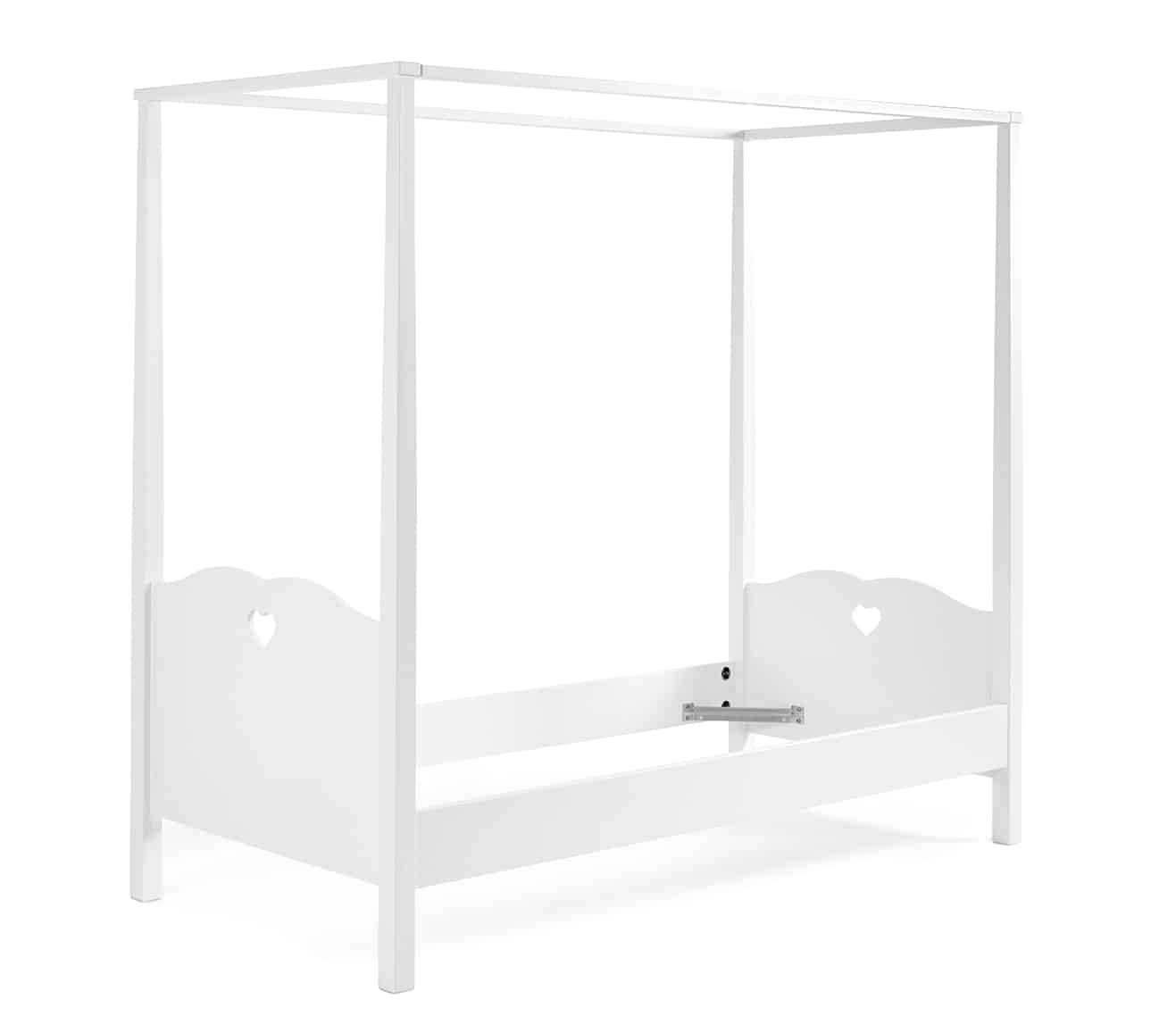 Het hemelbed (90 x 200 cm) in wit uit de AMORI collectie combineert een tijdloos, fris design met zachte, romantische accenten. Het is de favoriete kamer van iedereen die houdt van elegante meubels. Er is een lattenbodem voorzien met vast kader en 17 latten. De textielset met roze details en afwerking is speciaal ontworpen voor dit hemelbed. Het cre�ert een gezellige en geborgen slaapplek. De nachttafel beschikt over 3 ruime lades voor het opbergen van persoonlijke spullen. De 2-deurs kast bestaat uit 2 legplanken en een kledingrail. Laat je verleiden door de charme van deze kamer met hartjesdetail.