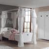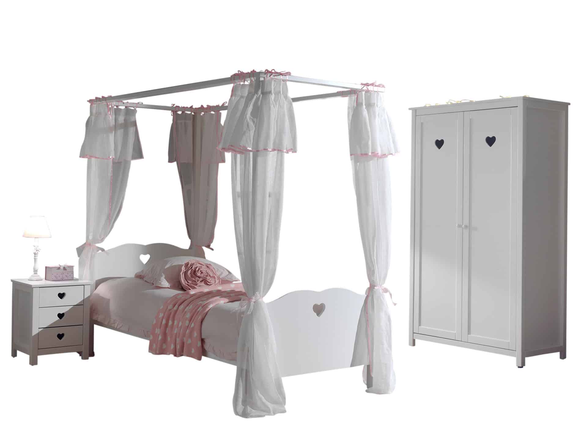 Het hemelbed (90 x 200 cm) in wit uit de AMORI collectie combineert een tijdloos, fris design met zachte, romantische accenten. Het is de favoriete kamer van iedereen die houdt van elegante meubels. De lattenbodem is niet inbegrepen, maar hiervoor raden wij een lattenbodem aan met vast kader. De textielset met roze details en afwerking is speciaal ontworpen voor dit hemelbed. Het cre�ert een gezellige en geborgen slaapplek. De nachttafel beschikt over 3 ruime lades voor het opbergen van persoonlijke spullen. De 2-deurs kast bestaat uit 2 legplanken en een kledingrail. Laat je verleiden door de charme van deze kamer met hartjesdetail.