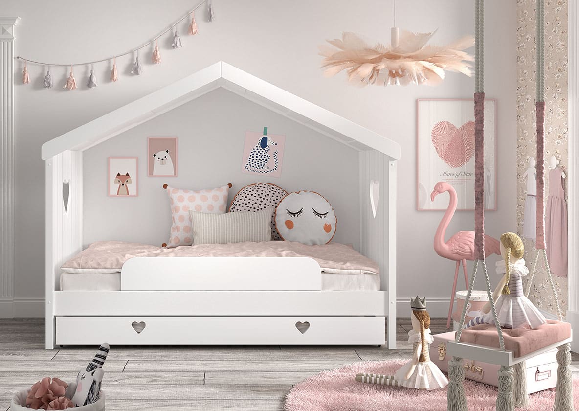 Het huisbed (90 x 200 cm) in wit zonder achterwand uit de AMORI collectie combineert een tijdloos, fris design met zachte, romantische accenten. Het is de favoriete kamer van iedereen die houdt van elegante meubels. De lattenbodem is inbegrepen en er is een uitvalbeveiliging voorzien. De bedlade biedt een extra slaapplek voor een gast maar kan net zo goed dienen als opbergruimte. Laat je verleiden door de charme van deze kamer met hartjesdetail.