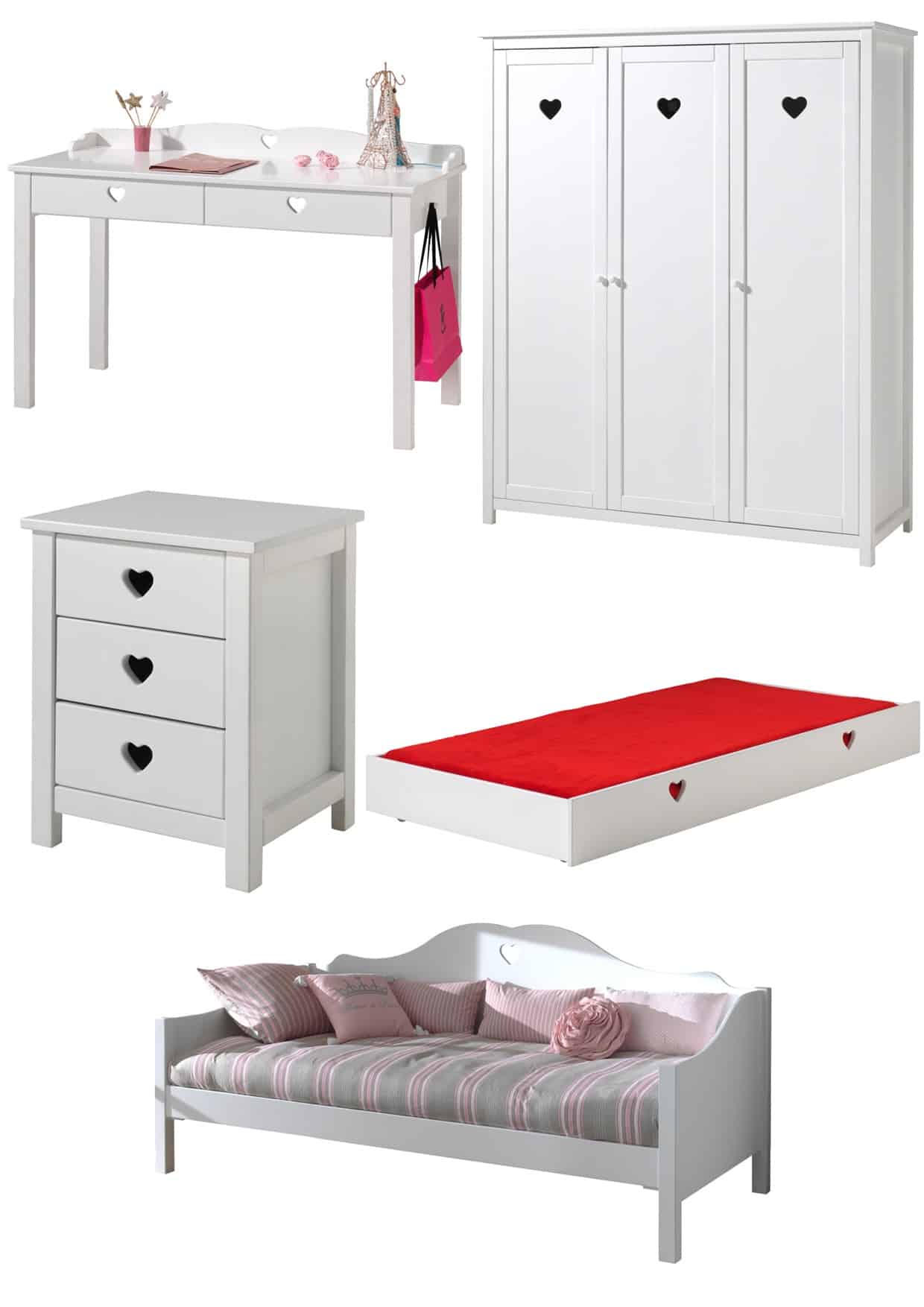 Het kajuitbed (90 x 200 cm) in wit uit de AMORI collectie combineert een tijdloos, fris design met zachte, romantische accenten. Het is de favoriete kamer van iedereen die houdt van elegante meubels. De lattenbodem is niet inbegrepen, maar hiervoor raden wij een lattenbodem aan met vast kader. Dit kajuitbed biedt meer dan alleen een plek om te slapen, het is eveneens een gezellige zitplek om te ontspannen, lezen of genieten van een rustig moment. De bedlade biedt een extra slaapplek voor een gast maar kan net zo goed dienen als opbergruimte. De nachttafel beschikt over 3 ruime lades. De kledingkast bestaat aan de linkerzijde uit 2 legplanken en 1 hangrail. Achter de rechterdeur bevinden zich 4 legplanken. Zo is er voldoende ruimte voor het opbergen van kledij, bedlinnen,� Het bureau heeft een ruim werkoppervlak en 2 lades. Laat je verleiden door de charme van deze kamer met hartjesdetail.