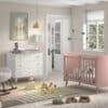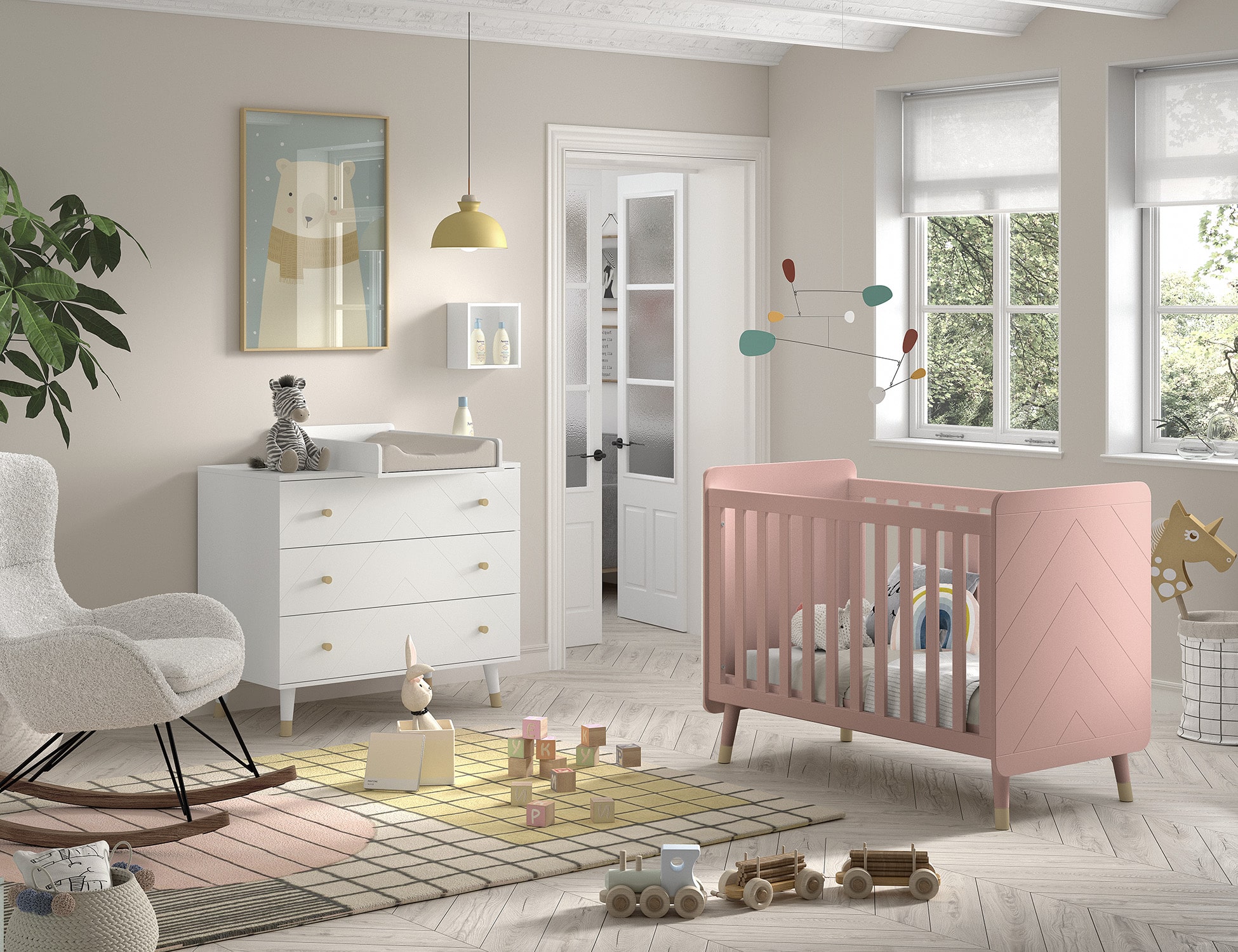 Het BILLY babybed (60 x 120 cm) in roze (terra pink) is een pronkstuk voor de babykamer. Het grafische patroon in combinatie met de gouden pootjes en handgrepen zorgen voor een retro modern karakter. Daarnaast zorgen de stevige constructie uit hoogwaardige MDF en verstelbare bodem voor veiligheid en comfort. Dit stijlvolle ontwerp geeft net dat tikkeltje meer aan de babykamer. De commode in wit (satin white) is voorzien van drie ruime lades zodat er voldoende ruimte is voor het opbergen van essenti�le items. De frontpanelen zijn afgewerkt met een grafisch motief en de handvaten zijn in een gouden kleur. Vergemakkelijk en verfraai de dagelijkse verzorging van je baby met het extra opzetstuk. Deze handige verzorgingsplank past perfect op deze commode en biedt een veilige plek om je baby te verschonen en verzorgen door de opstaande randen en stevige constructie. Dit stijlvolle ontwerp geeft net dat tikkeltje meer aan de baby- of kinderkamer.