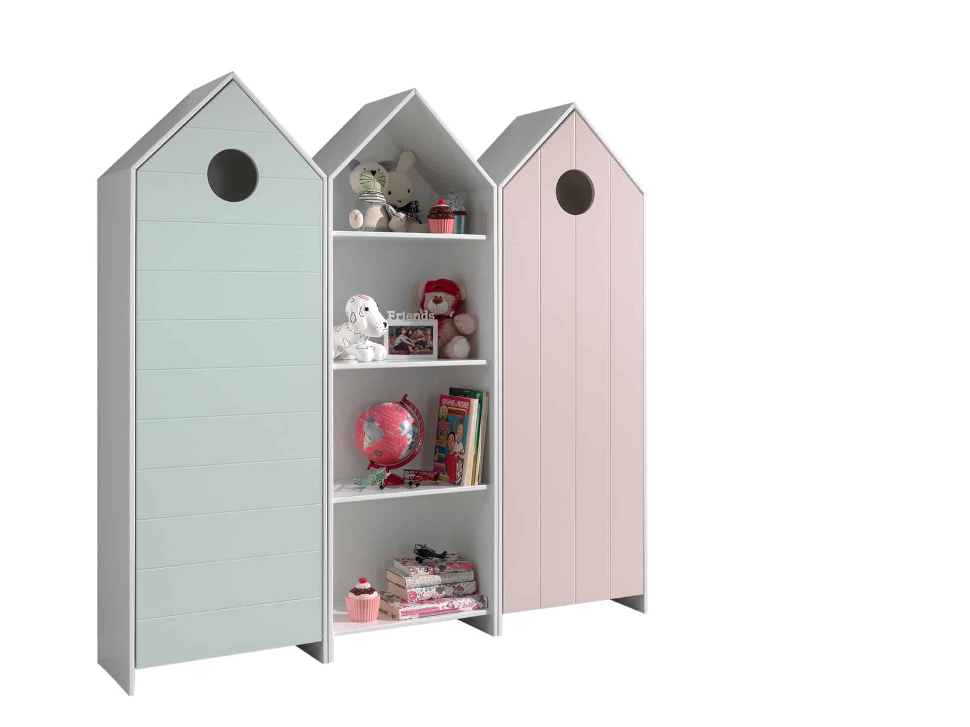 Deze combinatie uit de CASAMI collectie bestaat uit 3 kasten in de vorm van een strandhuisje. Deze geven meteen een speelse en kleurrijke toets aan elke kinderkamer. De kastje met roze en mintgroene deur beschikken over 3 legplanken en een kledinghanger die naar eigen keuze kunnen worden ingedeeld. Bij de open kast is er geen kledinghanger voorzien. Er is dus voldoende opbergruimte voorzien voor kledij, speelgoed, boeken, beddengoed,… Deze kastjes zijn een echte eye-catcher die elke baby- of kinderkamer compleet maakt.