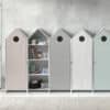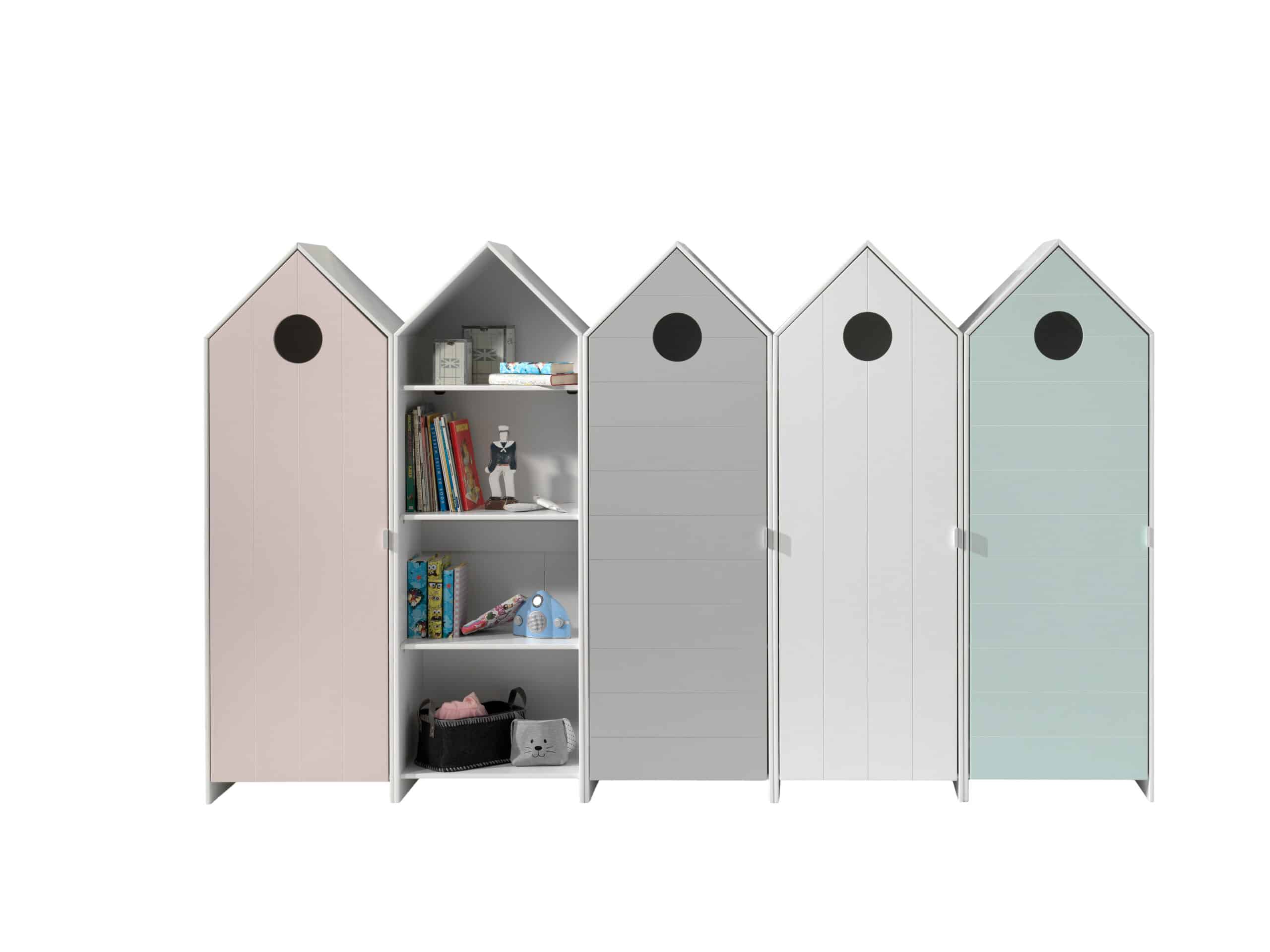 Deze combinatie uit de CASAMI collectie bestaat uit 5 kasten in de vorm van een strandhuisje. Deze geven meteen een speelse en kleurrijke toets aan elke kinderkamer. De kasten met deurtjes in pastelkleuren (roze, wit, grijs en mintgroen) beschikken over 3 legplanken en een kledinghanger die naar eigen keuze kunnen worden ingedeeld. Bij de open kast is er geen kledinghanger voorzien. Er is dus voldoende opbergruimte voorzien voor kledij, speelgoed, boeken, beddengoed,… Deze kastjes zijn een echte eye-catcher die elke baby- of kinderkamer compleet maakt.
