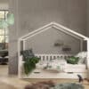 Het DALLAS huisbed (90 x 200 cm) met hekje in de kleur wit is vervaardigd in massieve den. Het speelse design is een echte blikvanger elke kinderkamer. Dit bed beschikt over een hekje langs 3 kanten dat kan dienen als uitvalbeveiliging, maar dat ook ideaal is als zitbank. Maak het extra gezellig met kleurrijke kussens, dekentjes en een lichtslinger als decoratie. Onderaan de bedlade zijn wieltjes voorzien zodat deze gemakkelijk kan worden in- en uitgetrokken. Deze bedlade biedt een extra slaapplek voor een gast maar kan net zo goed dienen als extra opbergruimte.