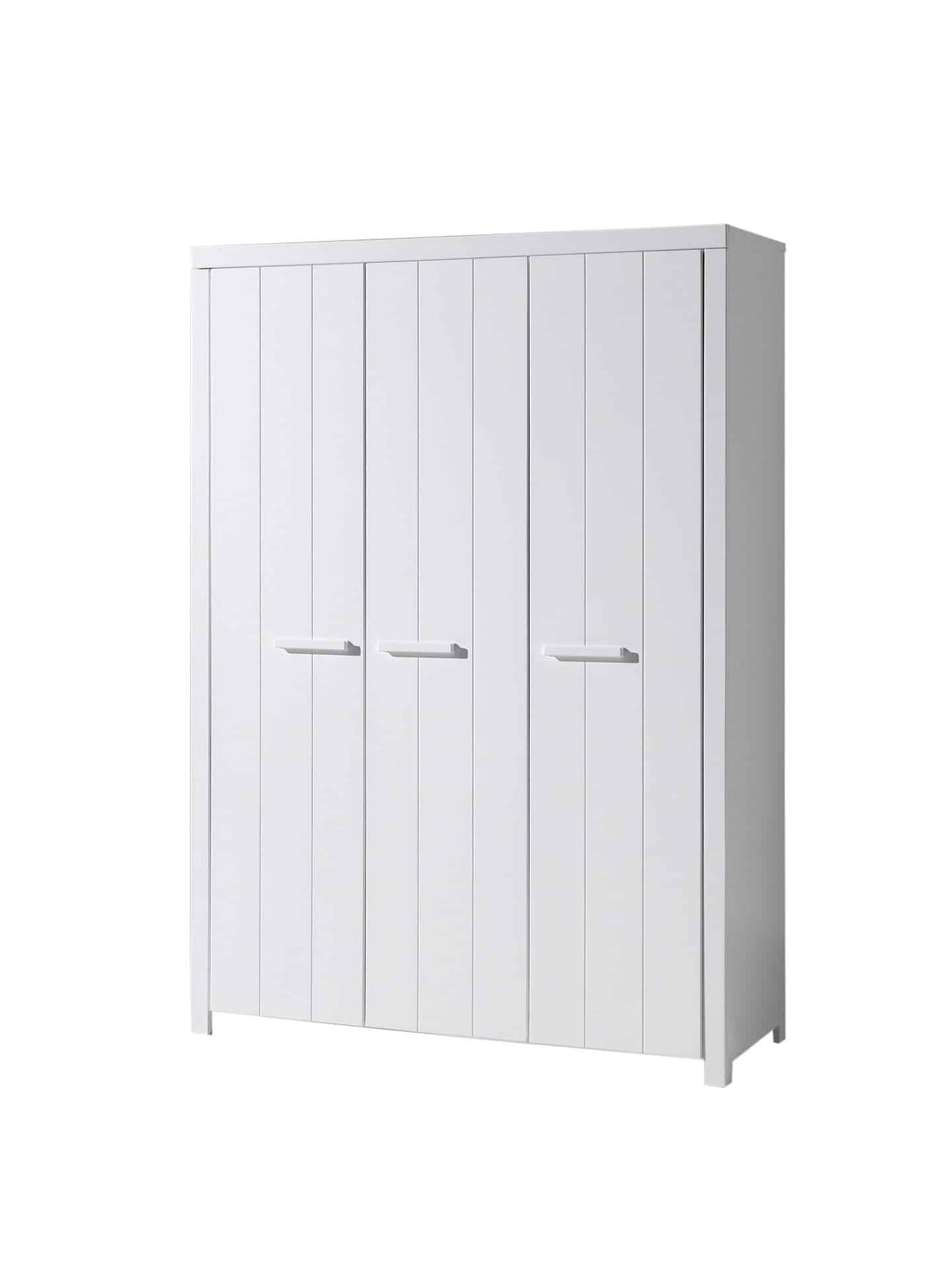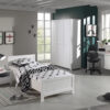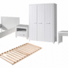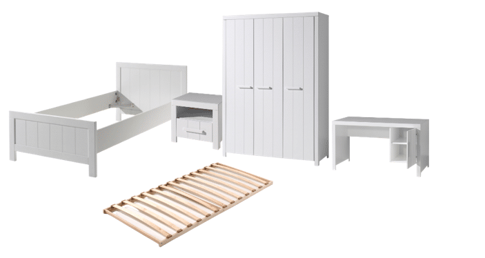 Dit bed (90×200) van de ERIK collectie is vervaardigd in wit gelakte MDF in combinatie met massief grenen. De lattenbodem bestaande uit 13 latten is inclusief. Het hoofd- en voeteinde van het bed hebben een verticaal gefreesd detail. Het nachtkastje beschikt over 1 legplank en 1 lade. De 3-deurs kleerkast beschikt over een kledinghanger en 2 legplanken over de gehele breedte van 2 deuren en 4 legplanken achter de derde deur. Het bureau beschikt over een ruim schrijfoppervlak en 1 kast aan de rechterzijde. Het eenvoudige, maar landelijk uiterlijk van deze collectie maakt dat het past in elke kinder- of jeugdkamer.