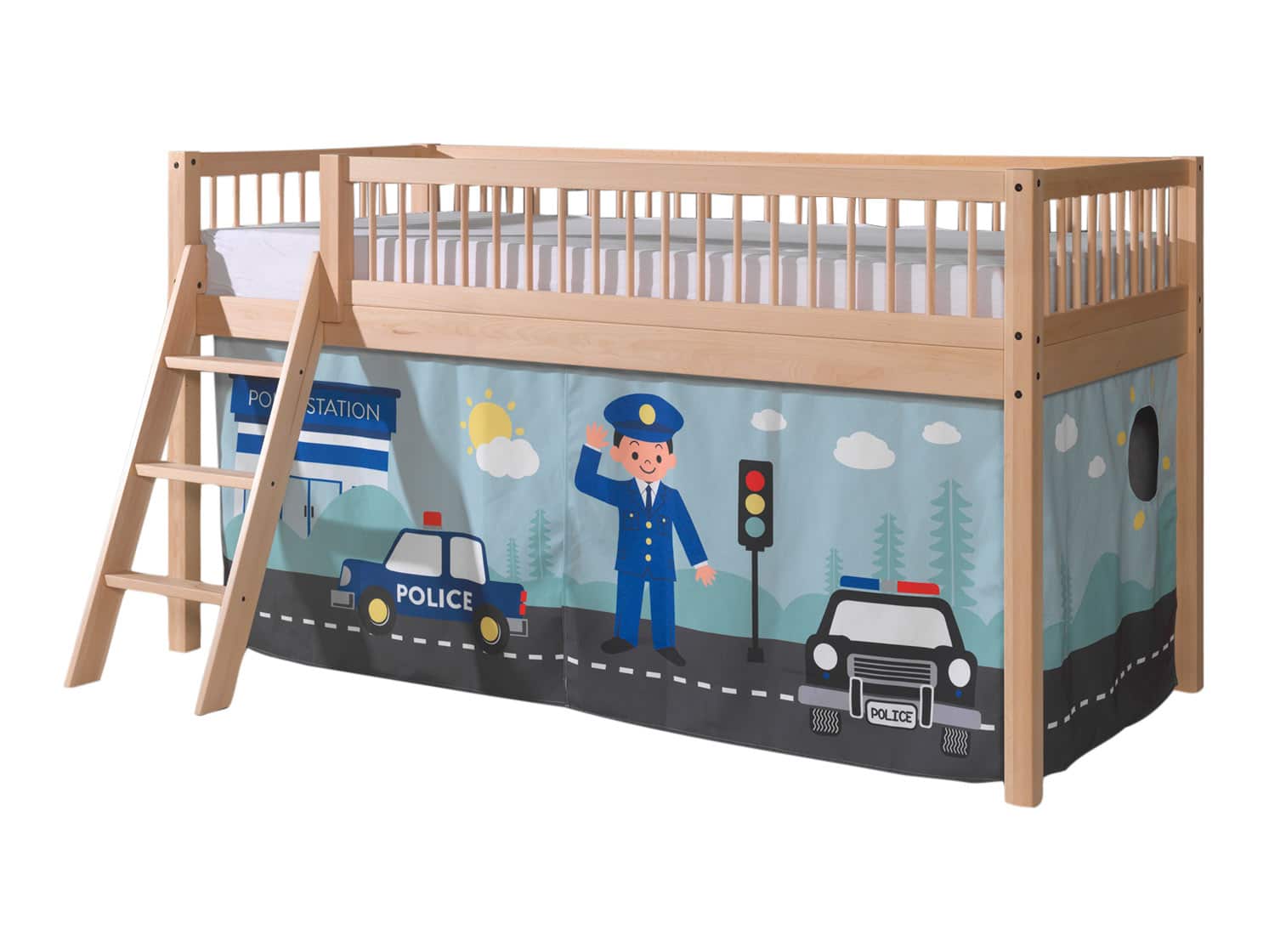 De FORREST BEECH hoogslaper (90 x 200 cm) in natuur is vervaardigd uit hoogwaardige kwalitatieve Europese beuk. Deze stijlvolle ruimtebesparende halfhoogslaper kan gepersonaliseerd worden met een optionele textielset die de warme uitstraling van het hout extra benadrukt. De ruimte onder het bed kan gebruikt worden om te spelen of als opbergruimte. De ladder kan zowel links als rechts gemonteerd worden. De FORREST collectie is ontworpen met oog voor detail en straalt kwaliteit uit op elk niveau. Het speelgordijn in het thema Police is hierop een perfecte aanvulling. Kinderen genieten met volle teugen van hun verborgen speelparadijs onder hun bed!