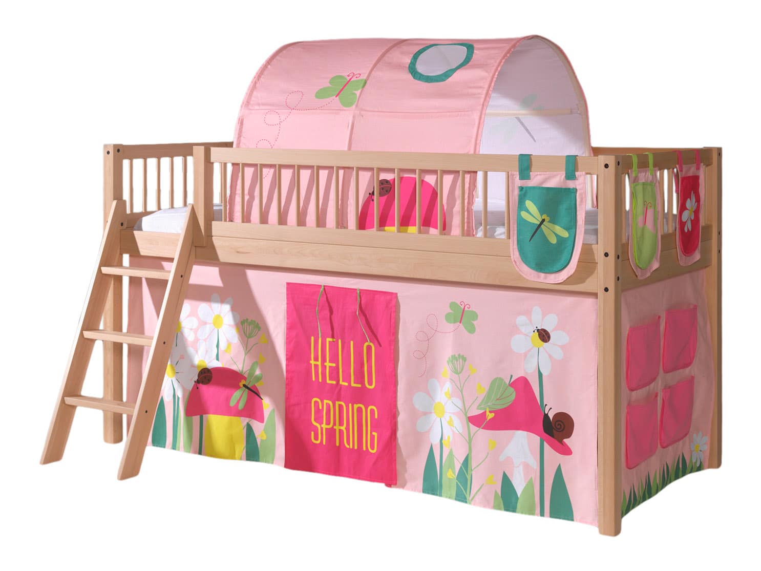 De FORREST BEECH hoogslaper (90 x 200 cm) in natuur is vervaardigd uit hoogwaardige kwalitatieve Europese beuk. Deze stijlvolle ruimtebesparende halfhoogslaper kan gepersonaliseerd worden met een optionele textielset die de warme uitstraling van het hout extra benadrukt. De ruimte onder het bed kan gebruikt worden om te spelen of als opbergruimte. De ladder kan zowel links als rechts gemonteerd worden. De FORREST collectie is ontworpen met oog voor detail en straalt kwaliteit uit op elk niveau. De textielset in het thema Spring is hierop een perfecte aanvulling. Kinderen genieten met volle teugen van hun verborgen speelparadijs onder hun bed!