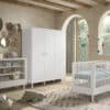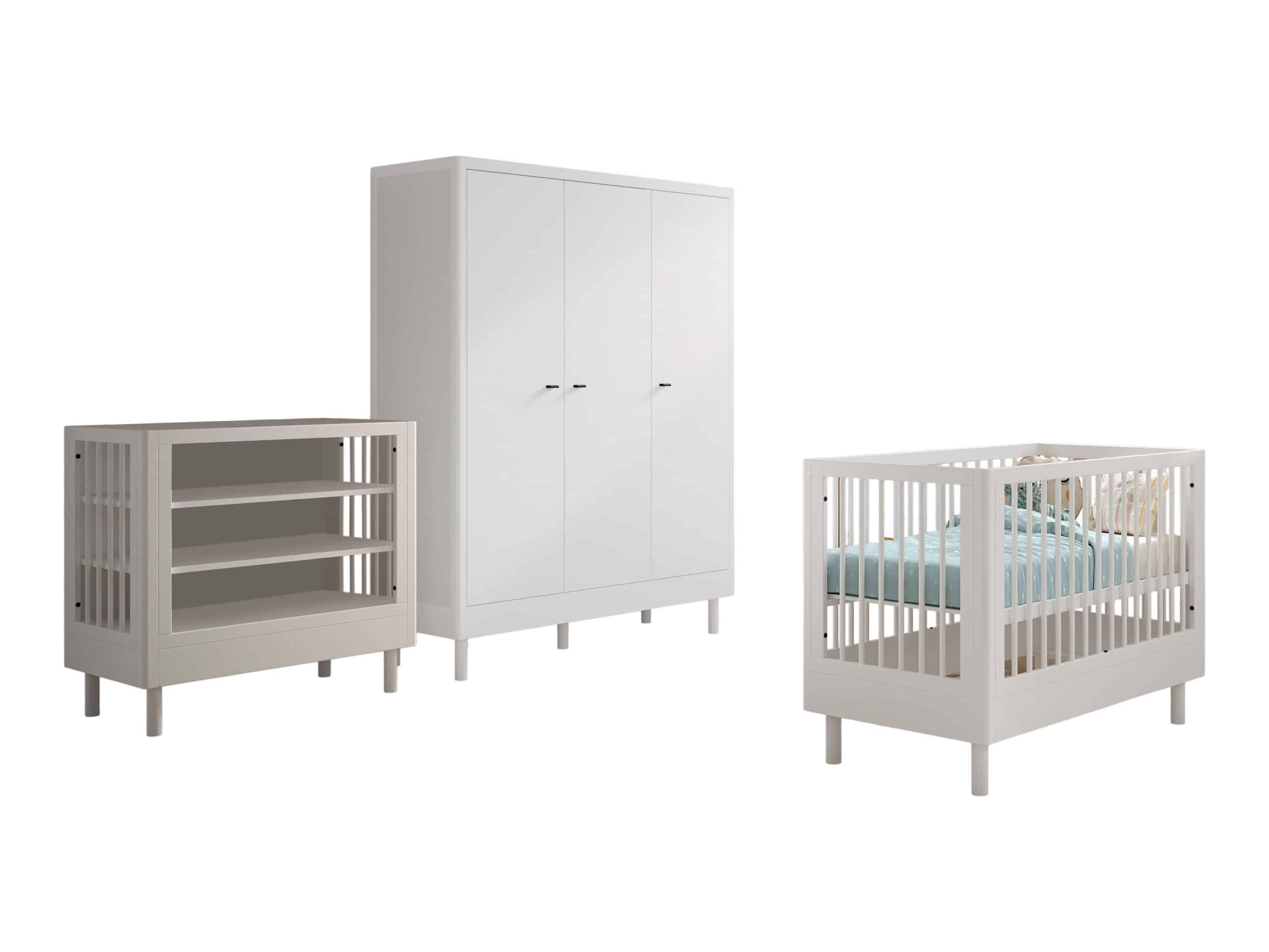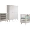 Het FORREST BEECH babybed (60 x 120 cm) in wit is vervaardigd uit hoogwaardige kwalitatieve Europese beuk. Het bed is ontworpen met verticale spijlen aan alle vier zijden voor optimale veiligheid en zichtbaarheid. Ook kan de lattenbodem versteld worden op 3 verschillende hoogtes, zodat het zich aanpast aan de behoeften van het opgroeiende kind. Dankzij het stevige frame en de verfijnde afwerking is dit bed een veilige plek voor je baby. De verzorgingstafel heeft 2 open legplanken en combineert functionaliteit met een tijdloze stijl. Dit is een ideale toevoeging aan elke ruimte die een oplossing nodig heeft voor verzorgingsactiviteiten of opbergbehoeften. Aan de linkerzijde van de kleerkast bevindt zich 2 legplanken en een kledingrail. Achter de rechterdeur zijn er nog eens 4 legplanken zodat er voldoende ruimte is voor het opbergen van kledij, beddengoed,… De FORREST collectie is ontworpen met oog voor detail en straalt kwaliteit uit op elk niveau.