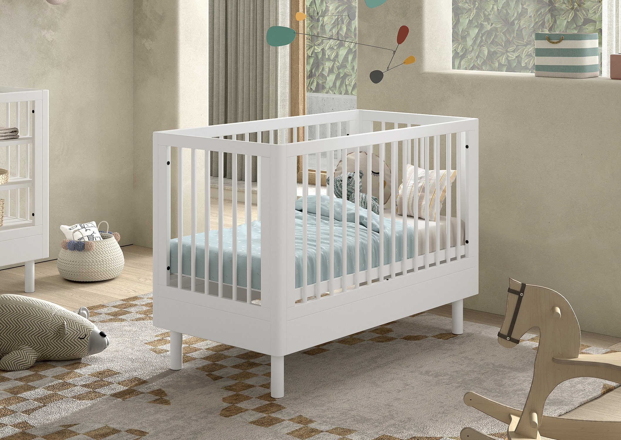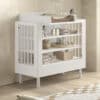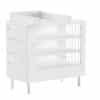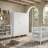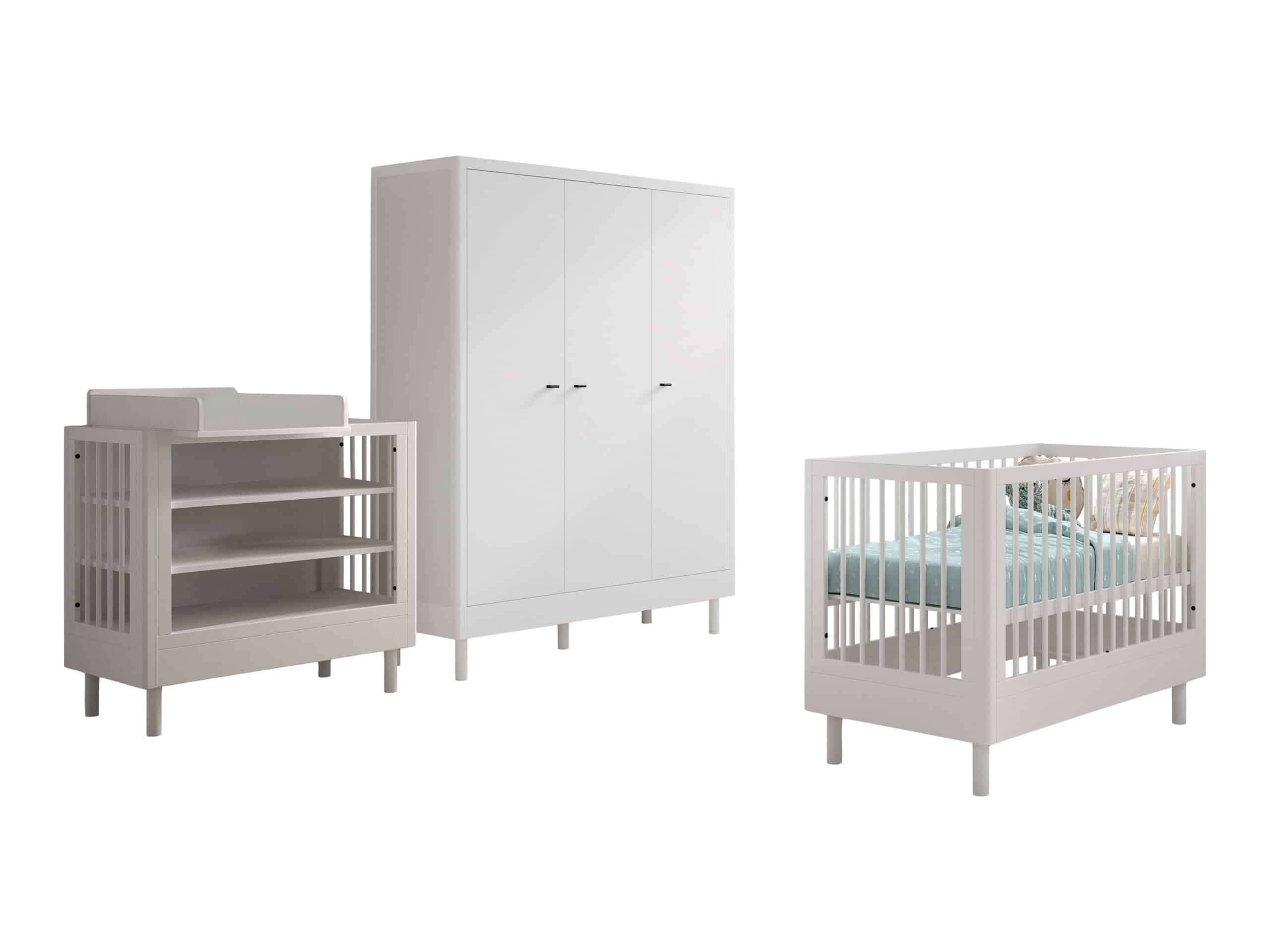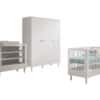 Het FORREST BEECH babybed (60 x 120 cm) in wit is vervaardigd uit hoogwaardige kwalitatieve Europese beuk. Het bed is ontworpen met verticale spijlen aan alle vier zijden voor optimale veiligheid en zichtbaarheid. Ook kan de lattenbodem versteld worden op 3 verschillende hoogtes, zodat het zich aanpast aan de behoeften van het opgroeiende kind. Dankzij het stevige frame en de verfijnde afwerking is dit bed een veilige plek voor je baby. De verzorgingstafel heeft 2 open legplanken en combineert functionaliteit met een tijdloze stijl. Dit is een ideale toevoeging aan elke ruimte die een oplossing nodig heeft voor verzorgingsactiviteiten of opbergbehoeften. Vergemakkelijk en verfraai de dagelijkse verzorging van je baby met het opzetstuk. Deze handige verzorgingsplank past perfect op de commode en de verzorginsgtafel van dezelfde collectie en biedt een veilige plek om je baby te verschonen en verzorgen door de opstaande randen en stevige constructie. Aan de linkerzijde van de kleerkast bevindt zich 2 legplanken en een kledingrail. Achter de rechterdeur zijn er nog eens 4 legplanken zodat er voldoende ruimte is voor het opbergen van kledij, beddengoed,… De FORREST collectie is ontworpen met oog voor detail en straalt kwaliteit uit op elk niveau.