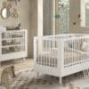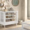Het FORREST BEECH babybed (70 x 140 cm) is vervaardigd uit hoogwaardige kwalitatieve Europese beuk. Het bed is ontworpen met verticale spijlen aan alle vier zijden voor optimale veiligheid en zichtbaarheid. Ook kan de lattenbodem versteld worden op 3 verschillende hoogtes en kunnen 3 spijlen worden uitgehaald. Dankzij het stevige frame en de verfijnde afwerking is dit bed een veilige plek voor je baby. Dit babybed kan worden omgevormd naar een peuterbed, waardoor het een veelzijdig meubelstuk is dat zich aanpast aan de groeiende behoeften van een kind. De verzorgingstafel heeft 2 open legplanken en combineert functionaliteit met een tijdloze stijl. Dit is een ideale toevoeging aan elke ruimte die een oplossing nodig heeft voor verzorgingsactiviteiten of opbergbehoeften. Vergemakkelijk en verfraai de dagelijkse verzorging van je baby met het opzetstuk. Deze handige verzorgingsplank past perfect op de commode en de verzorginsgtafel van dezelfde collectie en biedt een veilige plek om je baby te verschonen en verzorgen door de opstaande randen en stevige constructie. De FORREST collectie is ontworpen met oog voor detail en straalt kwaliteit uit op elk niveau.