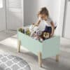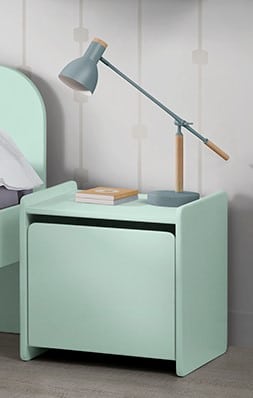 Het KIDDY bed (90 x 200 cm) in mintgroen is vervaardigd uit gelakte MDF en heeft een warme uitstraling door het afgeronde hoofd- en voeteinde, de zachte pastelkleur en de poten in massief hout. Een rollattenbodem is inbegrepen. De nachttafel heeft ook afgeronde randen en beschikt over 1 deur voor het opbergen van persoonlijke spullen. De safety rail zorgt ervoor dat jouw kindje tijdens het slapen niet uit het bed kan vallen en draagt zo bij tot een goede nachtrust voor zowel ouder als kind. De speelkoffer beschikt over 2 verticale planken die de box in 3 vakken verdeelt. Ideaal voor het opbergen van speelgoed, boekjes en knuffels.