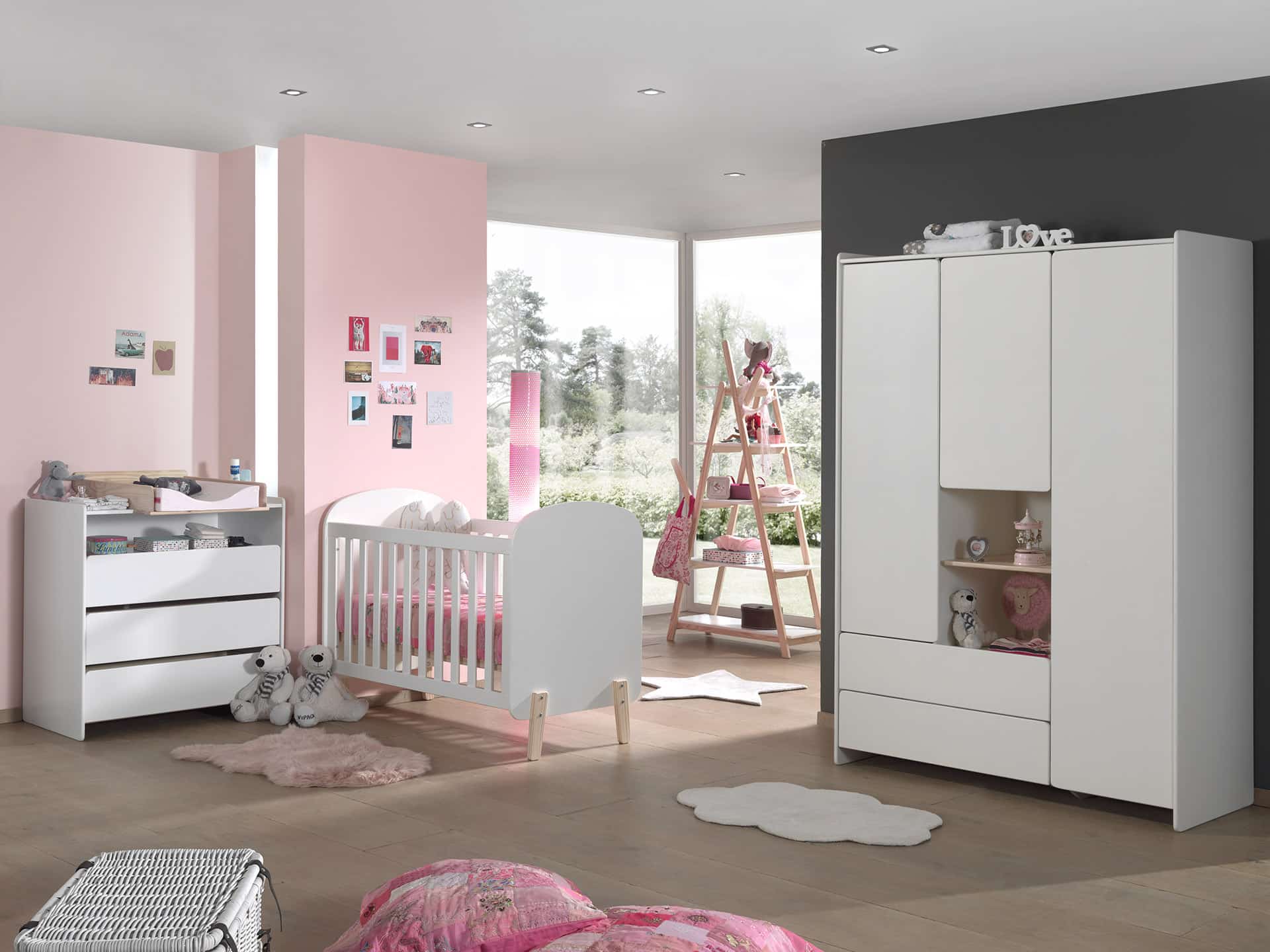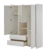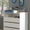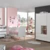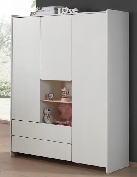 Het KIDDY babybed (60 x 120 cm) is vervaardigd uit wit gelakte MDF en heeft een warme uitstraling door het afgeronde hoofd- en voeteinde, de zachte witte kleur en de poten in massief hout. De lattenbodem is verstelbaar op 3 hoogtes zodat het zich aanpast aan de behoeften van het opgroeiende kind. De commode beschikt over 3 laden en een open vak die voldoende opbergruimte bieden voor kledij, beddengoed, persoonlijke spullen,… De luierplank in massieve den zorgt voor een mooie Scandinavische look in combinatie met de wit gelakte commode. Deze handige verzorgingsplank biedt een veilige plek om je baby te verschonen en verzorgen door de opstaande randen en stevige constructie. De 3-deurs kleerkast beschikt over 3 deuren en 2 lades met voldoende legplanken en een hangrail voor het opbergen van kledij en beddengoed. Het speelse en functionele design van de boekenkast past in elk interieur en biedt voldoende ruimte voor het uitstallen van boeken, schoolmateriaal en persoonlijke spullen.