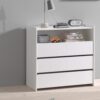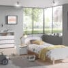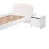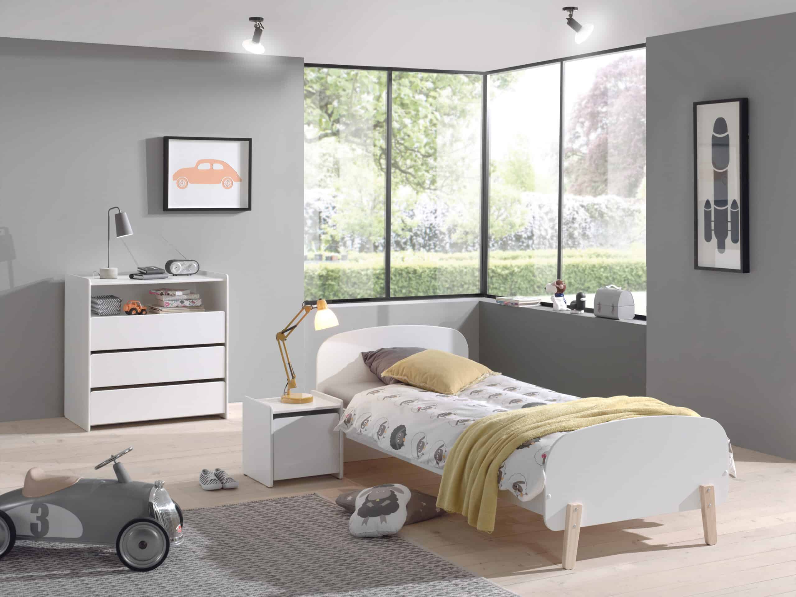 Het KIDDY bed (90 x 200 cm) in wit is vervaardigd uit gelakte MDF en heeft een warme uitstraling door het afgeronde hoofd- en voeteinde, de zachte kleur en de poten in massief hout. Een rollattenbodem is inbegrepen. De nachttafel heeft ook afgeronde randen en beschikt over 1 deur voor het opbergen van persoonlijke spullen. De commode heeft 3 laden en een open vak die voldoende opbergruimte bieden voor kledij, beddengoed, persoonlijke spullen,…