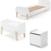 Het KIDDY bed (90 x 200 cm) in wit is vervaardigd uit gelakte MDF en heeft een warme uitstraling door het afgeronde hoofd- en voeteinde, de zachte kleur en de poten in massief hout. Een rollattenbodem is inbegrepen. De nachttafel heeft ook afgeronde randen en beschikt over 1 deur voor het opbergen van persoonlijke spullen. De speelkoffer beschikt over 2 verticale planken die de box in 3 vakken verdeelt. Ideaal voor het opbergen van speelgoed, boekjes en knuffels.
