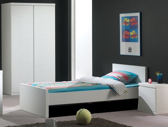 Dit bed (90×200) van de LARA collectie is vervaardigd in wit gelakte MDF in combinatie met massief grenen. De lattenbodem is inclusief en het hoofd- en voeteinde hebben een horizontaal gefreesd detail. Het nachtkastje heeft 1 deur met een horizontaal gefreesd detail en soft-close systeem. De 2-deurs kleerkast beschikt aan de linkerkant over een kledingroede en een legplank. De rechterkant heeft 4 legplanken. De kast heeft een horizontaal gefreesd detail en beschikt over een soft-close systeem. Het eenvoudige maar strakke uiterlijk van deze collectie maakt dat het past in elke kinder- of jeugdkamer.