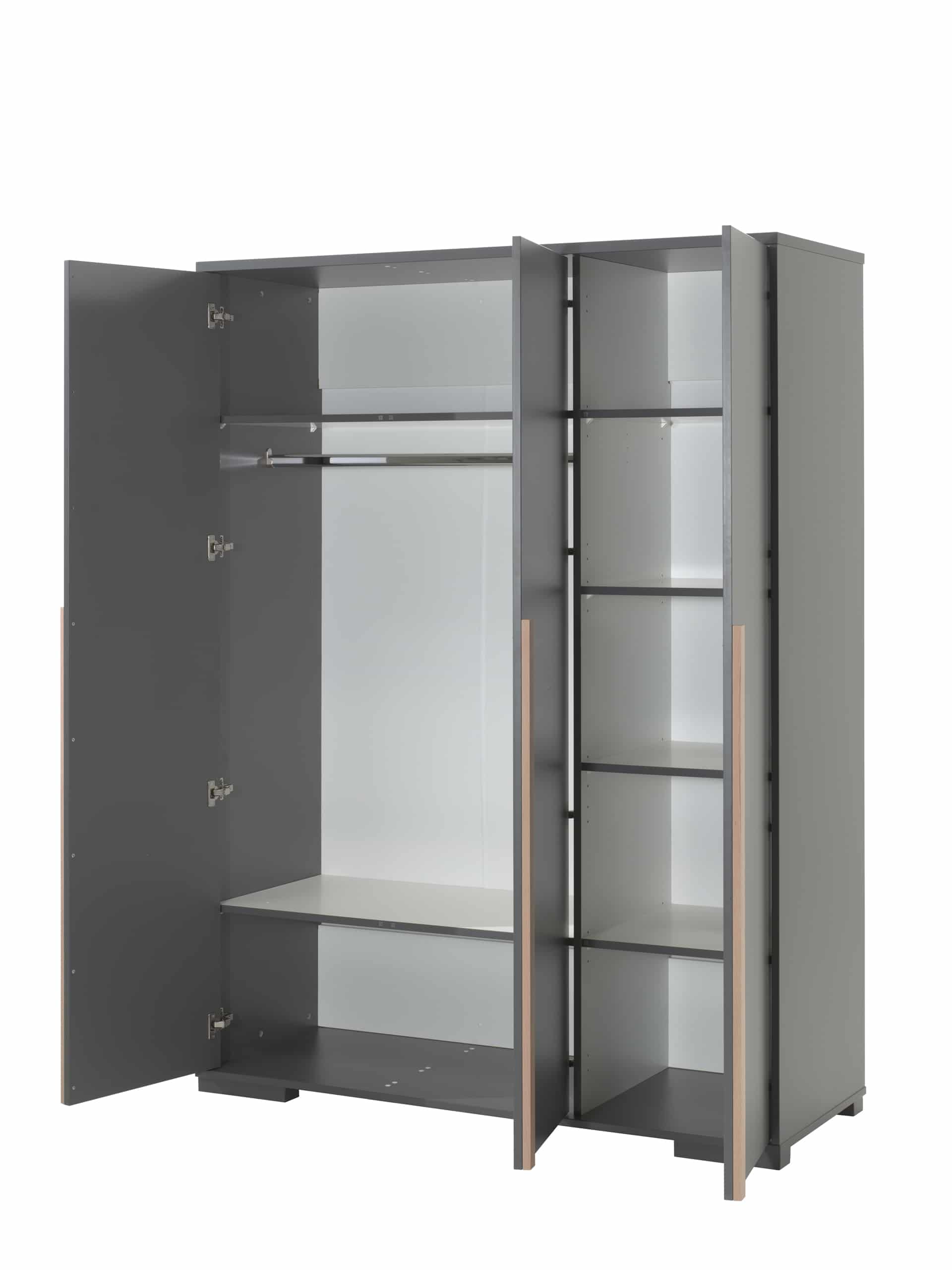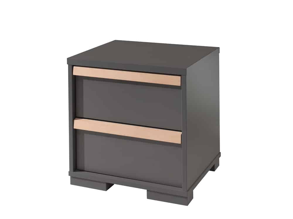Het LONDON bed (90×200) in antraciet heeft een Scandinavisch karakter door de combinatie met massief grenen. Het bed werd afgewerkt in witte melamine wat zeer stevig en krasvrij is. Het bijhorende rolbed kan ingezet worden als extra slaapplaats voor logees of als opbergruimte. Er zijn wieltjes voorzien zodat de lade gemakkelijk kan worden in- en uitgetrokken. Het nachtkastje beschikt over 2 uiterst handige lades die elk beschikken over een soft-close systeem. De 3-deurs kleerkast beschikt over 2 legplanken en heeft ook een hangreel over de gehele breedte van 2 deuren. Achter de 3de deur bevinden zich 4 legplanken. De smaakvolle accenten geven deze collectie meteen een stijlvol uiterlijk.