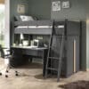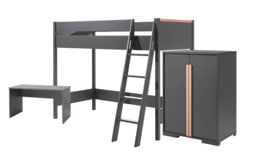 De LONDON hoogslaper (90×200) in antraciet heeft een Scandinavisch uitzicht in combinatie met de massieve den. De ruimte onder het bed kan benut worden als speelhoek of als studeerhoek, door middel van een bureau onder te plaatsen. Dit bureau beschikt over een ruim schrijfoppervlak. De ladder van het bed kan zowel links al rechts geplaatst worden. De bijhorende 2-deurs kleerkast beschikt over 2 legplanken. er is dus voldoende ruimte voorzien voor het opbergen van schoolboeken, kledij en speelgoed. De ideale manier om de ruimte optimaal te benutten.