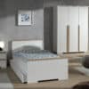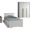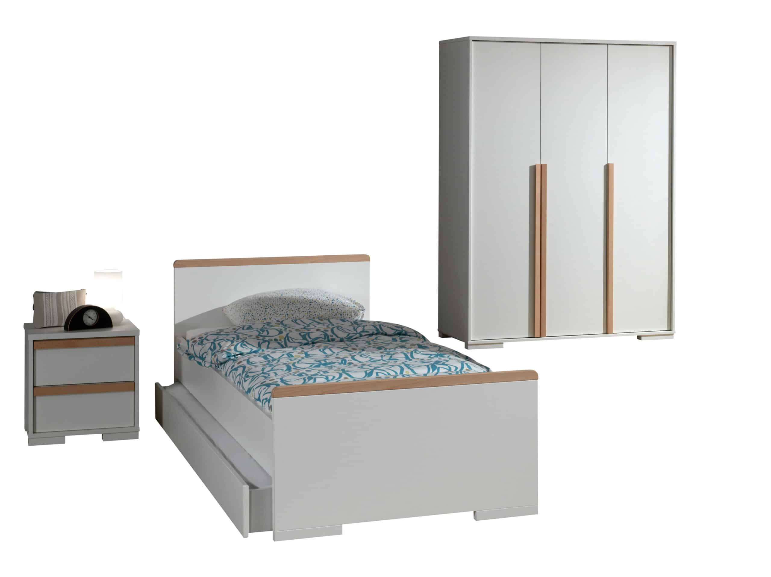 Het LONDON bed (90×200) in wit heeft een Scandinavisch karakter door de combinatie met massief grenen. Het bed werd afgewerkt in witte melamine wat zeer stevig en krasvrij is. Het bijhorende rolbed kan ingezet worden als extra slaapplaats voor logees of als opbergruimte. Er zijn wieltjes voorzien zodat de lade gemakkelijk kan worden in- en uitgetrokken. Het nachtkastje beschikt over 2 uiterst handige lades die elk beschikken over een soft-close systeem. De 3-deurs kleerkast beschikt over 2 legplanken en heeft ook een hangreel over de gehele breedte van 2 deuren. Achter de 3de deur bevinden zich 4 legplanken. De smaakvolle accenten geven deze collectie meteen een stijlvol uiterlijk.