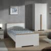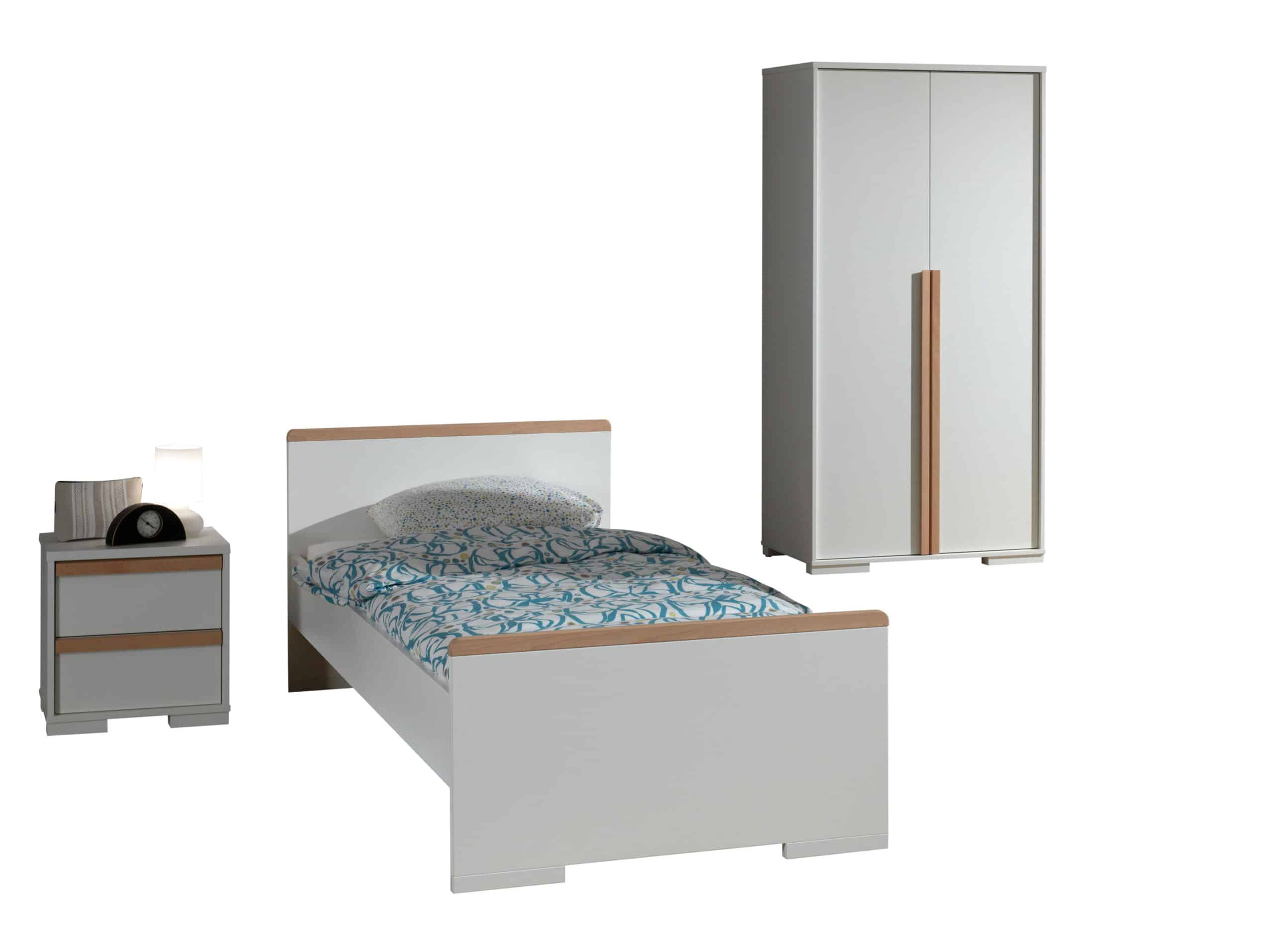 Het LONDON bed (90×200) in wit heeft een Scandinavisch karakter door de combinatie met massief grenen. Het bed werd afgewerkt in witte melamine wat zeer stevig en krasvrij is. Het nachtkastje beschikt over 2 uiterst handige lades die elk beschikken over een soft-close systeem. De 2-deurs kleerkast beschikt over 2 legplanken en heeft ook een hangreel over de gehele breedte van 2 deuren. De smaakvolle accenten geven deze collectie meteen een stijlvol uiterlijk.