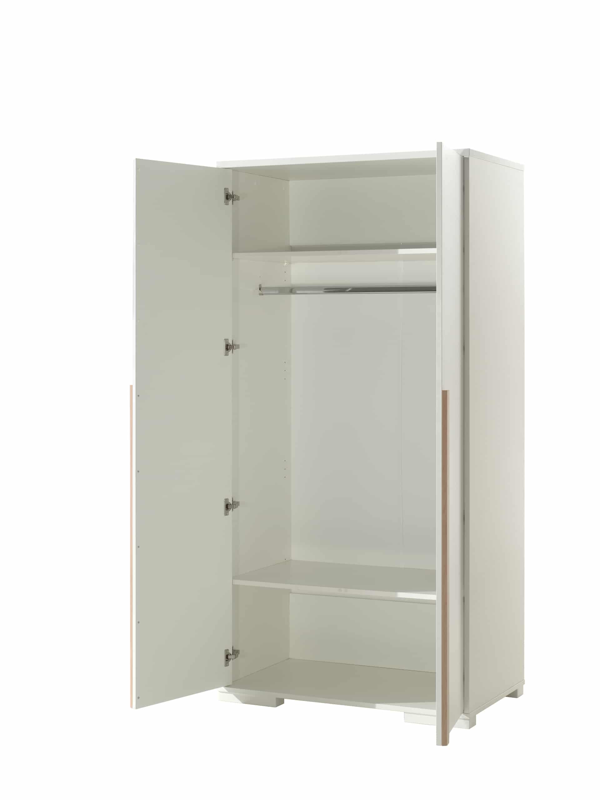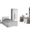 Het LONDON bed (90×200) in wit heeft een Scandinavisch karakter door de combinatie met massief grenen. Het bed werd afgewerkt in witte melamine wat zeer stevig en krasvrij is. Het bijhorende rolbed kan ingezet worden als extra slaapplaats voor logees of als opbergruimte. Er zijn wieltjes voorzien zodat de lade gemakkelijk kan worden in- en uitgetrokken. Het nachtkastje beschikt over 2 uiterst handige lades die elk beschikken over een soft-close systeem. De 2-deurs kleerkast beschikt over 2 legplanken en heeft ook een hangreel over de gehele breedte van 2 deuren. Het bureau heeft een ruim schrijfoppervlak en er is extra veel opbergruimte voorzien in de bijpassende rolcontainer. De boekenkast is onderverdeeld in 5 vakken door middel van 4 legplanken en is ideaal voor het opbergen van schoolmateriaal en boeken of het uitstallen van persoonlijke spulletjes. De smaakvolle accenten geven deze collectie meteen een stijlvol uiterlijk.