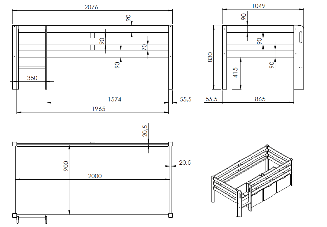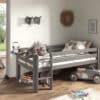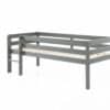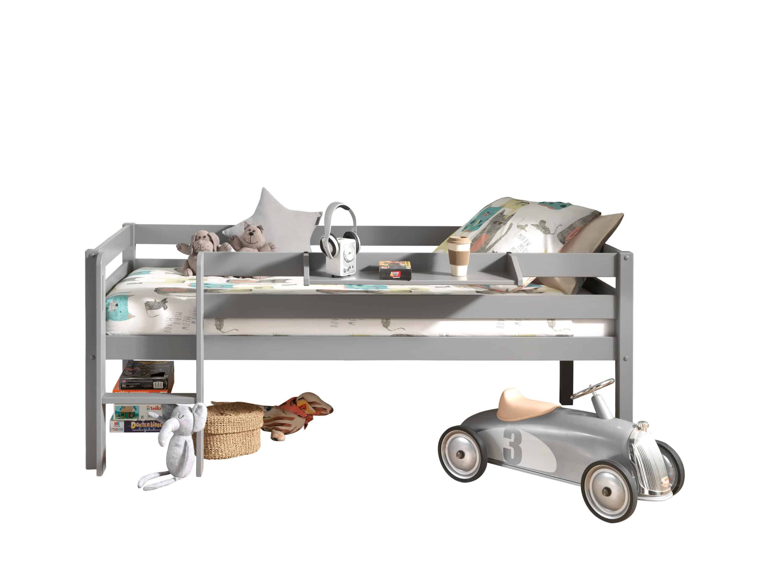 Deze PINO mid-sleeper is grijs gelakt en gemaakt uit massief Scandinavisch grenen hout. De lattenbodem is inclusief en is geschikt voor een matras van 90 x 200 cm. De ruimte tussen het bed en de grond is 41.5 cm. Bij deze combinatie is een Pino hangtablet inbegrepen.