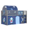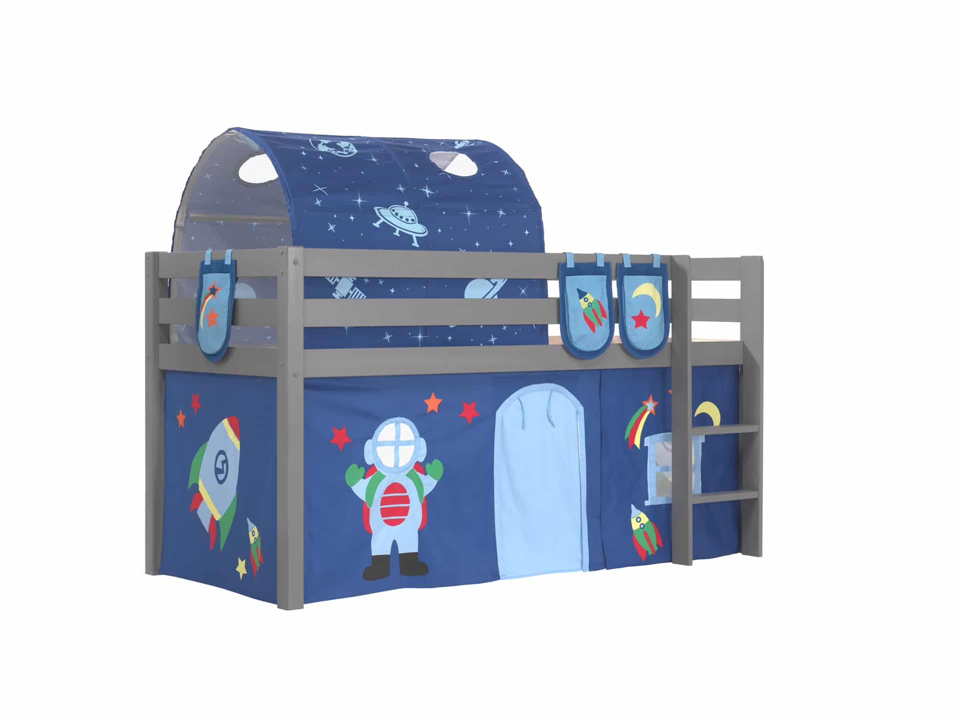 Deze PINO hoogslaper is vervaardigd van massief grenen en is grijs gelakt. De ladder kan zowel links als rechts gemonteerd worden. De lattenbodem is inbegrepen. De allround valbeveiliging, brede treden en goede stabiliteit maken dit bed heel veilig. De ruimte onder het bed kan gebruikt worden om te spelen of als opbergruimte. In het PINO gamma zijn verschillende mogelijkheden beschikbaar om dit bed aan te vullen met een bureau, bibliotheek, commodes, hangplankje of leuke textielset. Bij deze combinatie zijn een speelgordijn Astro, 3 zakjes Astro en een tunnel Astro inbegrepen.